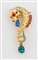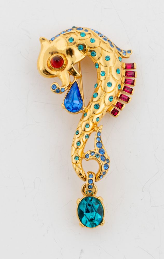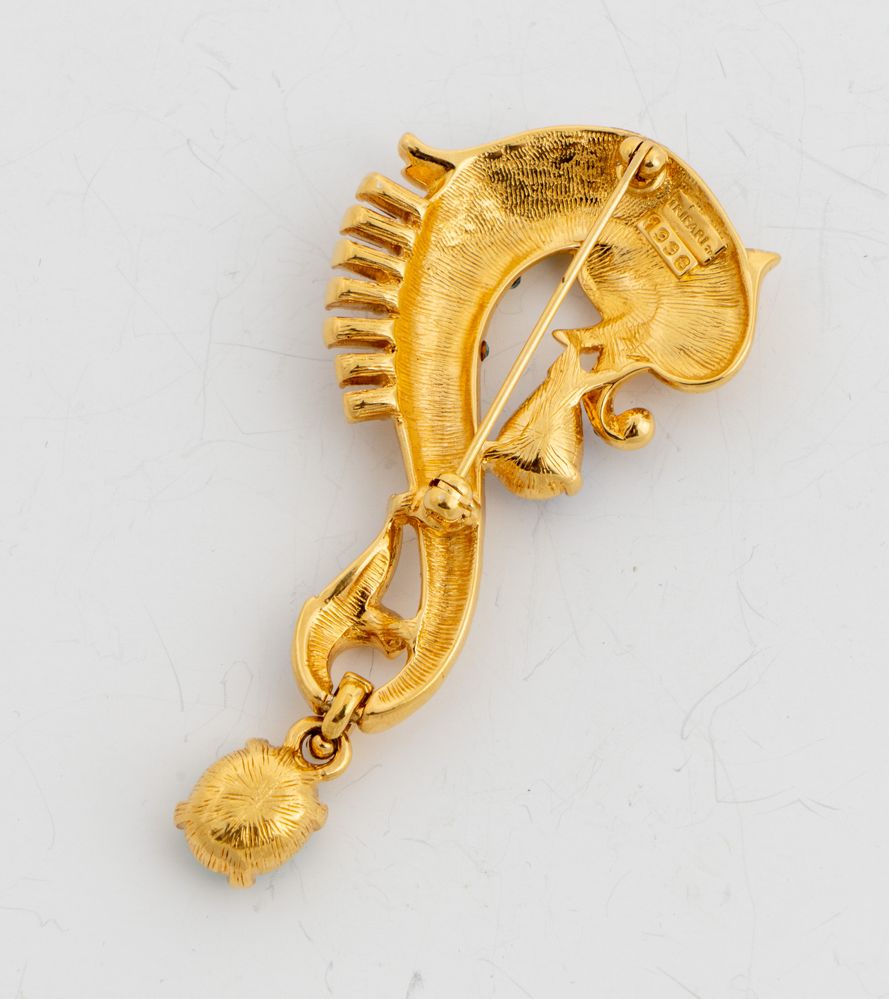 TRIFARI Spilla a forma di cavalluccio marino in metallo dorato arricchito da pietre vitree colorate. Anno 1996. Cm 7x3,5. Reca marchio Trifari 1996.