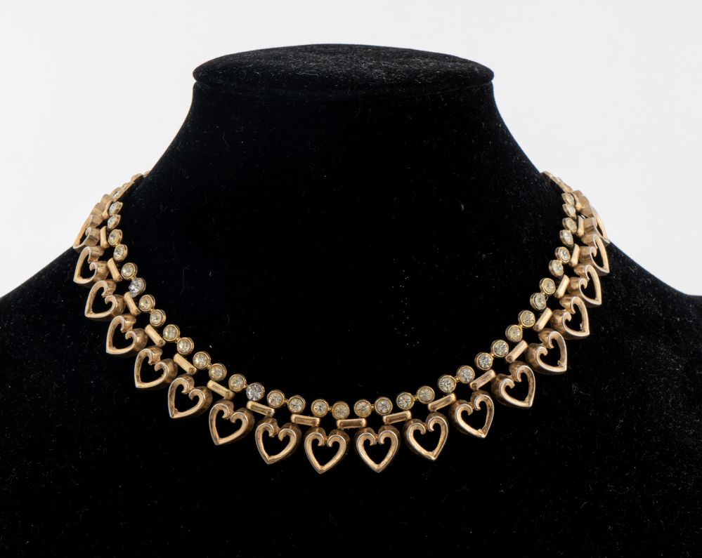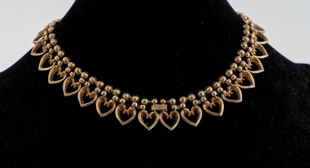 TRIFARI Collier con cuori in metallo dorato e applicazioni di zirconi. Cm 40x2. Reca marchio Trifari Pat Pend.