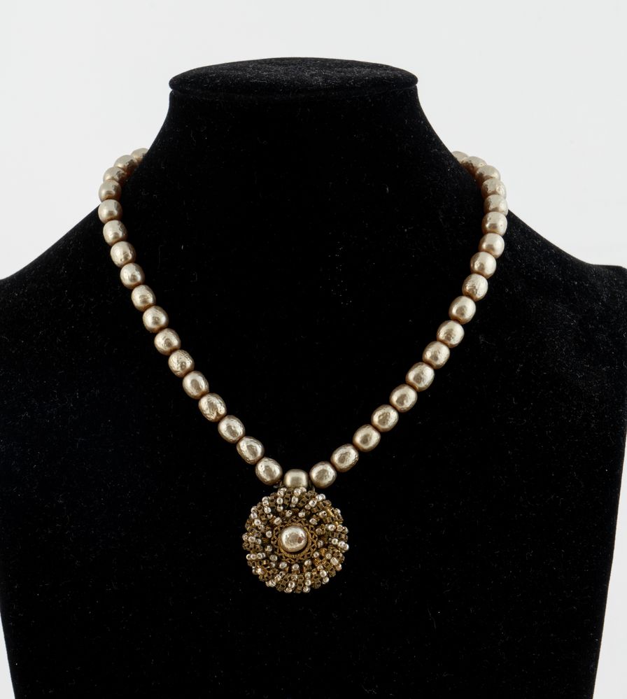 MIRIAM HASKELL Collana di perle sintetiche con ciondolo rotondo in metallo dorato e perla centrale. Lunghezza cm 43. Reca marchio Miriam Haskell.
