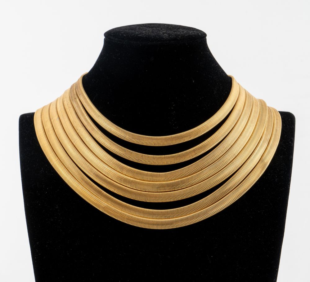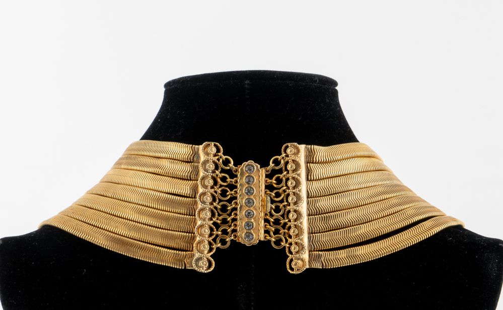 ANONIMO Collana composta da sette catene in metallo dorato con chiusura di zirconi. Girocollo: cm 38. Non reca marchi evidenti.