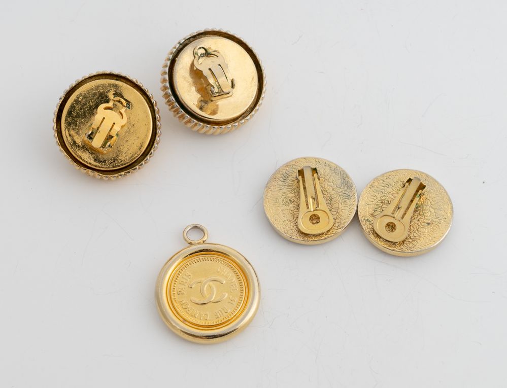 CHANEL (attribuito) Lotto composto da uno charme e due paia di orecchini in metallo dorato e smaltato. Rispettivamente di misure: diametro cm 3,1; diametro cm 3 cadauno; diametro cm 3,5 cadauno. Recano marchi Chanel 31 Rue Cambon Paris, Chanel e CC. (Lievi difetti)