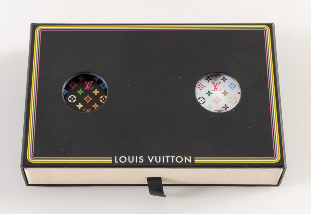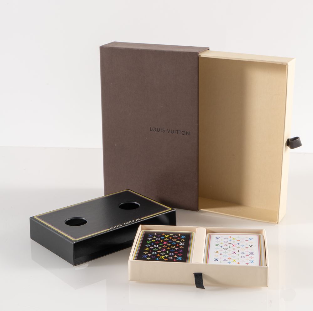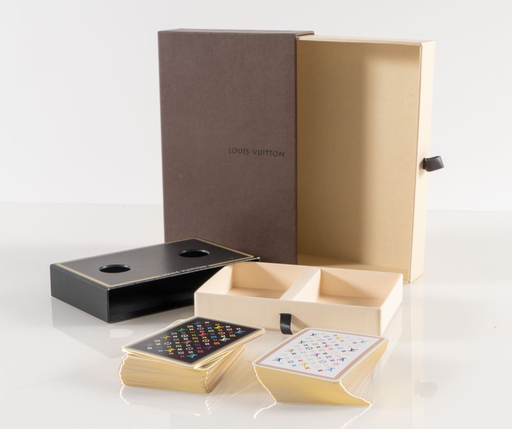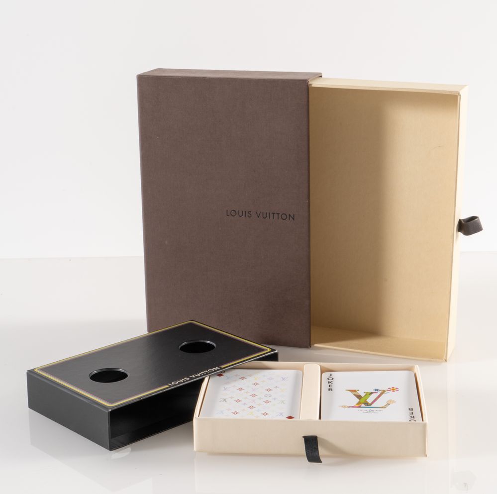 LOUIS VUITTON x TAKASHI MURAKAMI Carte da gioco realizzate in collaborazione con l'artista giapponese Takashi Murakami. Recano fantasia monogram LV sui toni del bianco e del nero. Collezione S/S 2003. Cm 14,7x9,7x2,7. Riportano marchi Louis Vuitton, LV e Louis Vuitton Paris Made in france. Corredate di scatola e controscatola originale.