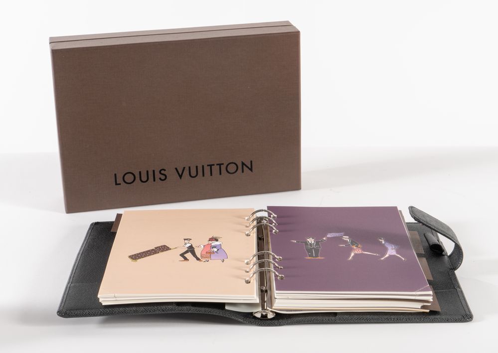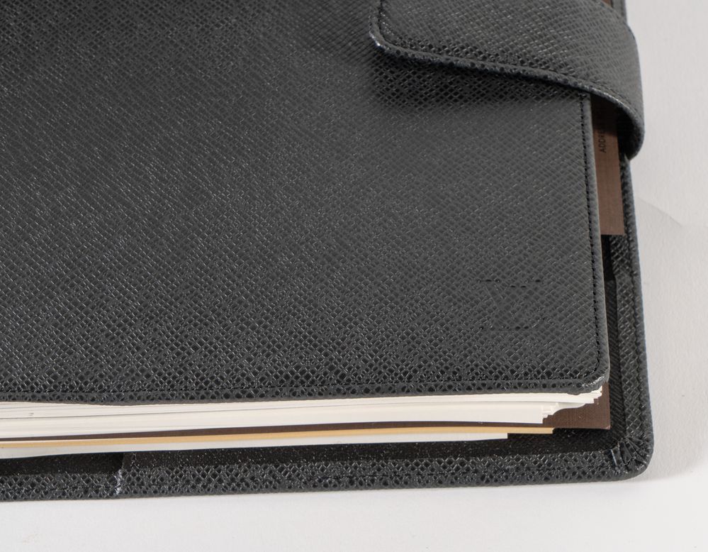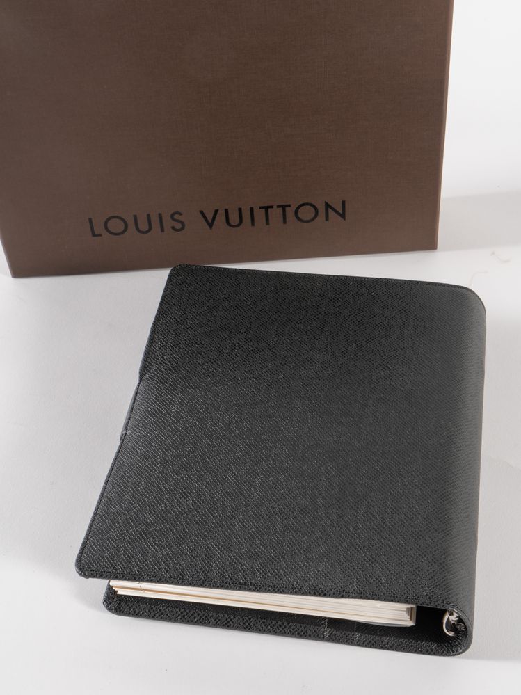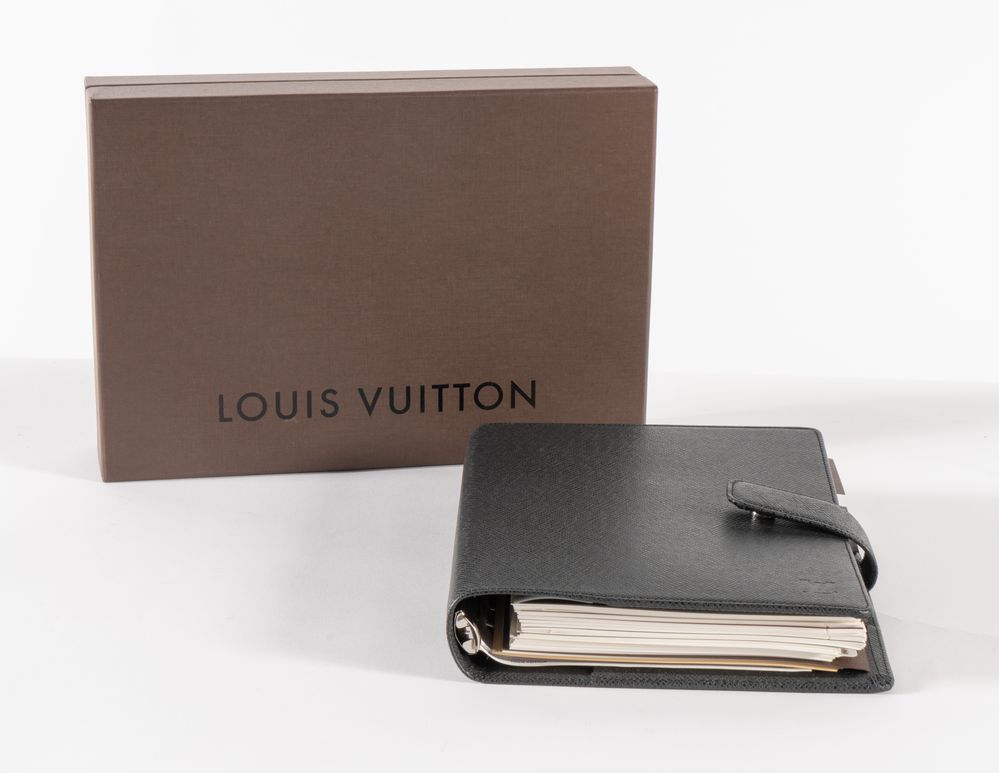 LOUIS VUITTON Agenda modello GM in pelle Taiga nera martellata. Anno 2012. Cm 23x18x4. Interno in pelle con cinque spazi porta documenti e portapenna. Reca marchi LV, Louis Vuitton Paris Made in France. Corredata di scatola originale.