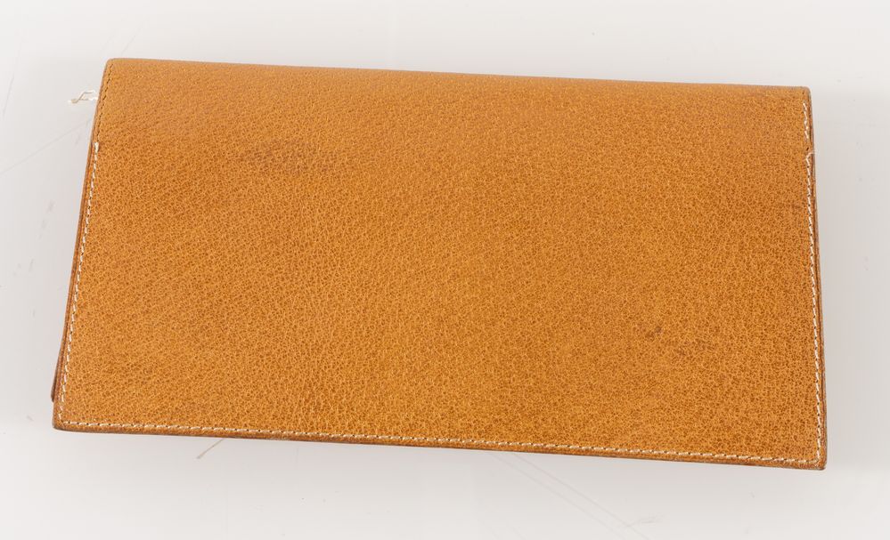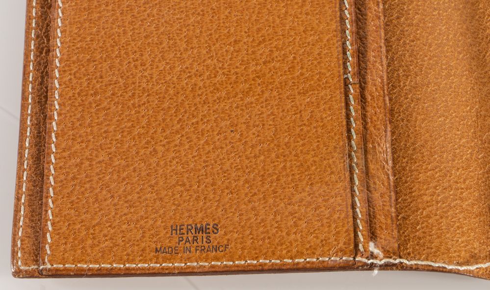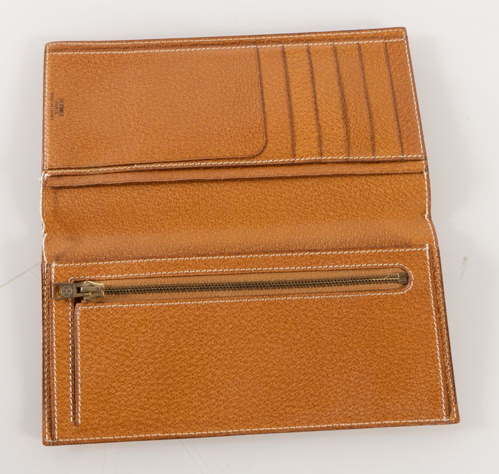 HERMÈS Portafoglio in pelle sui toni del marrone chiaro con cuciture bianche e dettagli in metallo dorato. Cm 18,5x10. Reca marchi Hermès Paris Made in France e Hermès H. (Difetti)