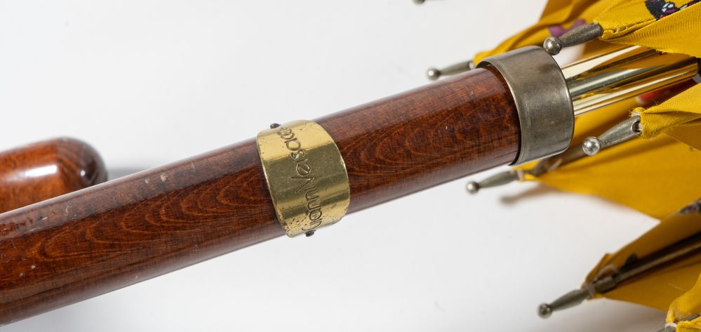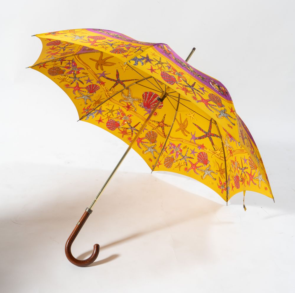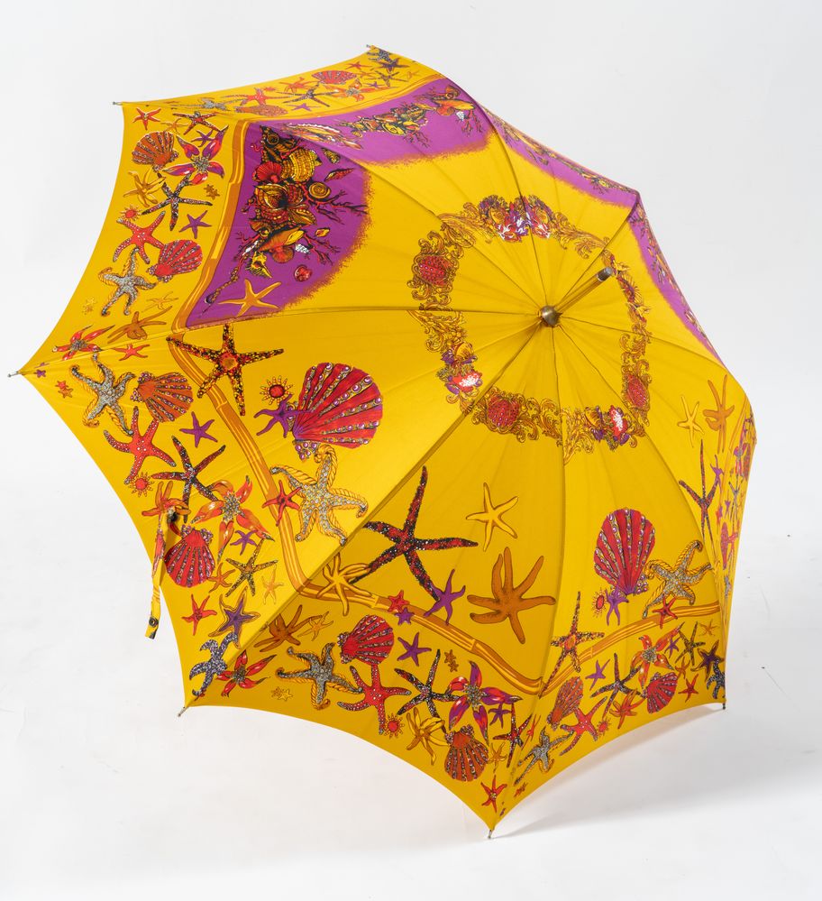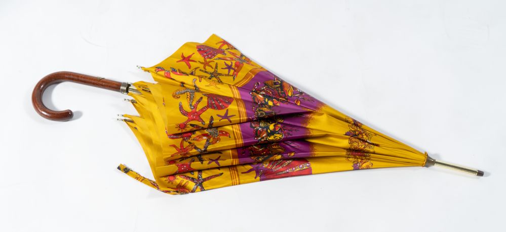 GIANNI VERSACE Ombrello in tela sui toni dell'ocra e del rosso con manico in legno. Lunghezza cm 90. Diametro cm 103. Reca marchio e targhetta Gianni Versace. (Lievi difetti)