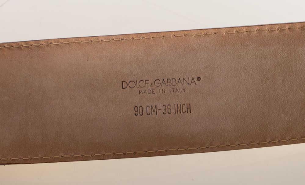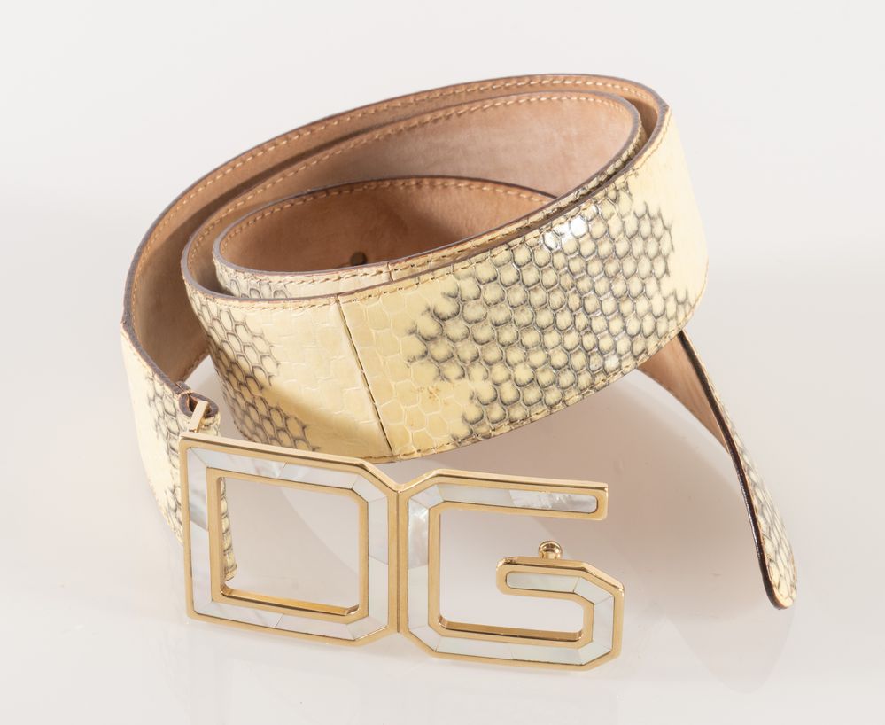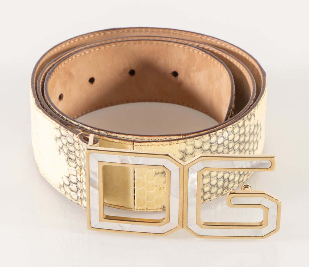 DOLCE & GABBANA Cintura in pelle stampata pitone sui toni del panna e del grigio con fibbia in metallo dorato e segmeti madreperlati. Riporta taglia 90cm. Lunghezza totale cm 97,5. Fascia: spessore cm 4. Fibbia: cm 4,5x9. Reca marchi DG e Dolce & Gabbana Made in Italy. (Lievi difetti)