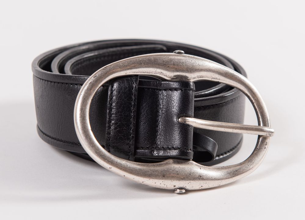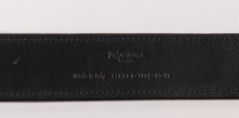 YVES SAINT LAURENT Rive Gauche Cintura in pelle nera con fibbia in metallo argentato. Lunghezza totale cm 96. Fascia: spessore cm 4. Fibbia: cm 7x11,5. Reca marchi YSL, Yves Saint Laurent Rive Gauche Made in Italy e codice di riferimento prodotto. (Difetti)