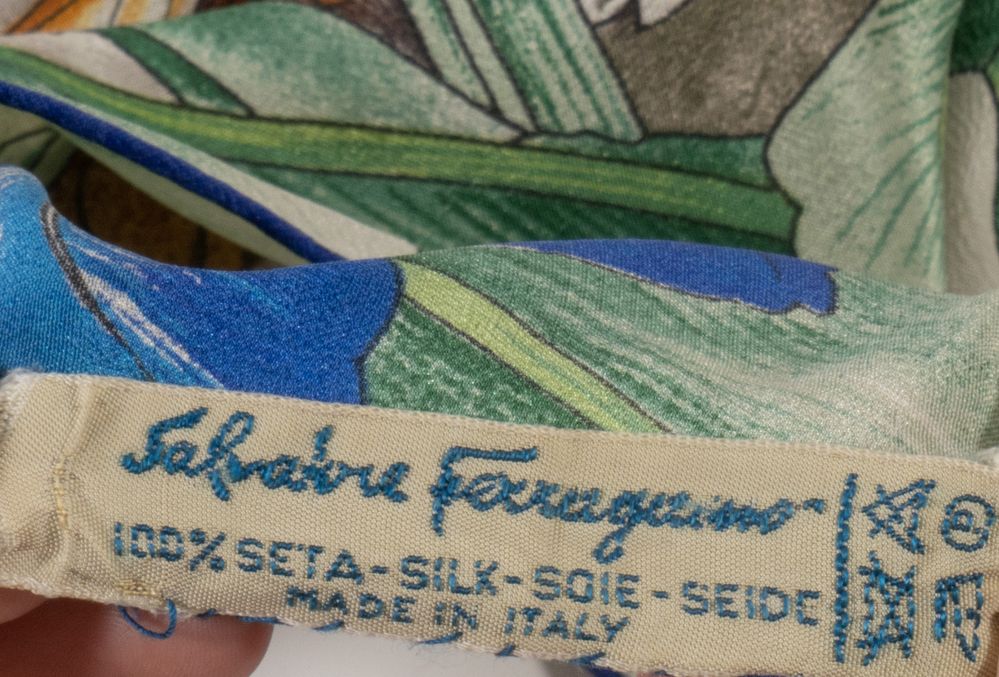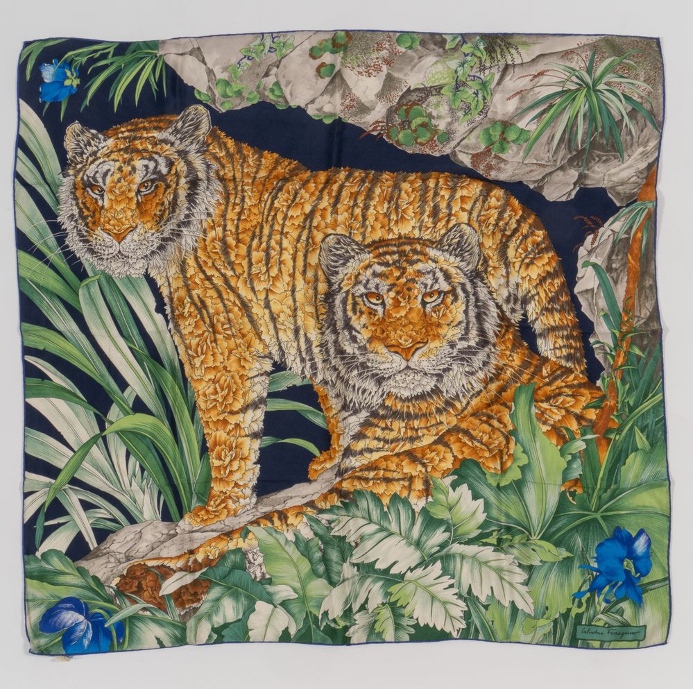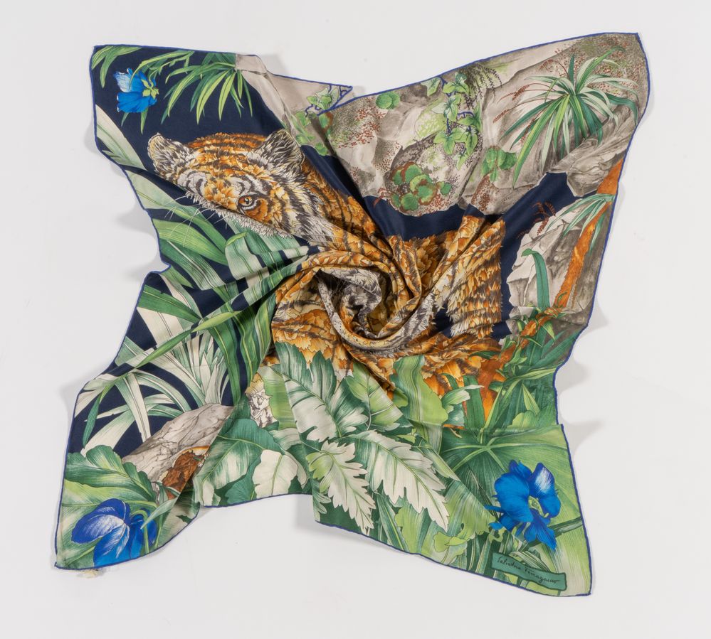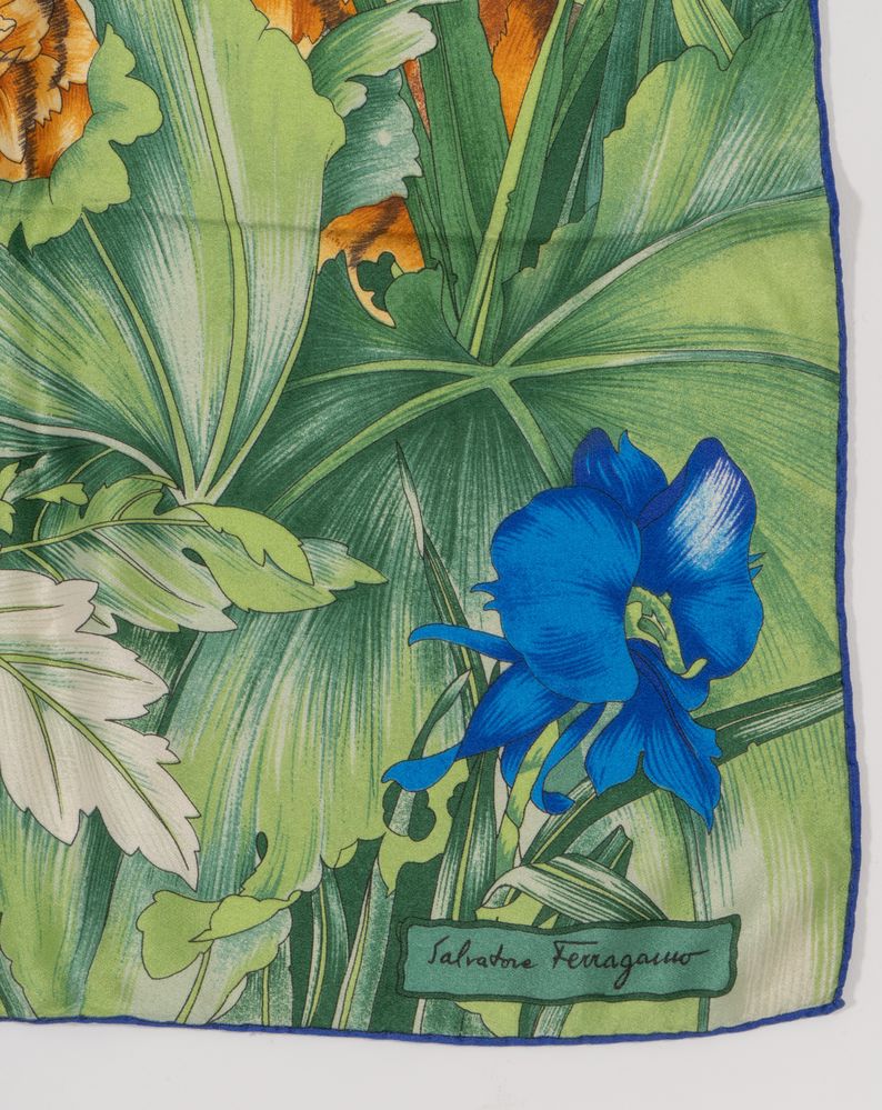 SALVATORE FERRAGAMO Foulard in seta a fantasia floreale con tigre. Cm 85x82. Composizione: 100% seta. Reca marchio ed etichetta Salvatore Ferragamo Made in Italy. (Lievissimi difetti)