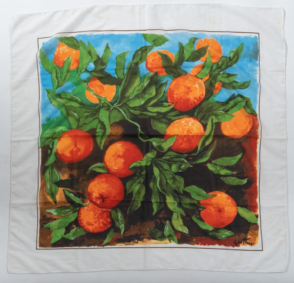 RENATO GUTTUSO Foulard a fantasia con disegno raffigurante arance. Cm 89x89. Reca firma Guttuso in basso a destra. (Lievi difetti)