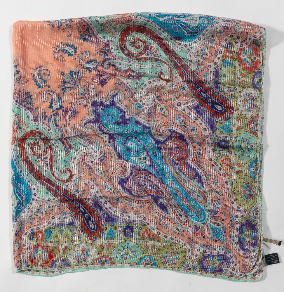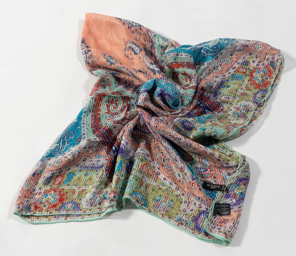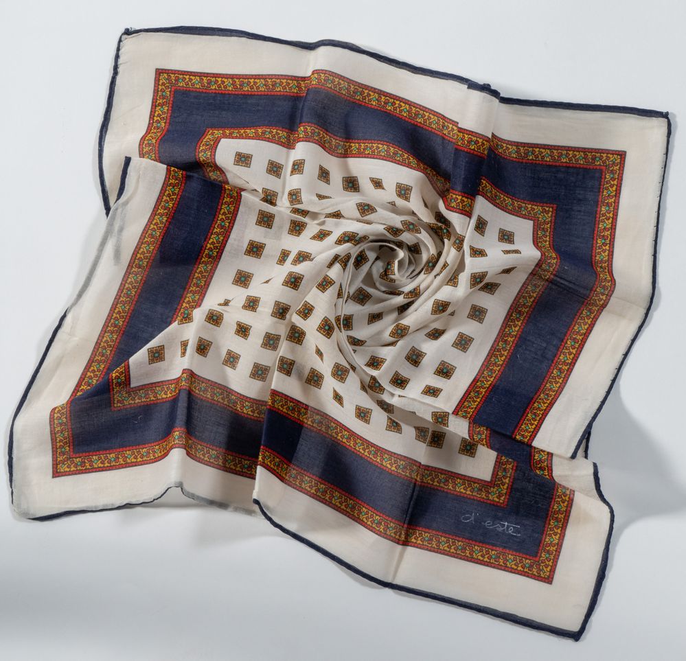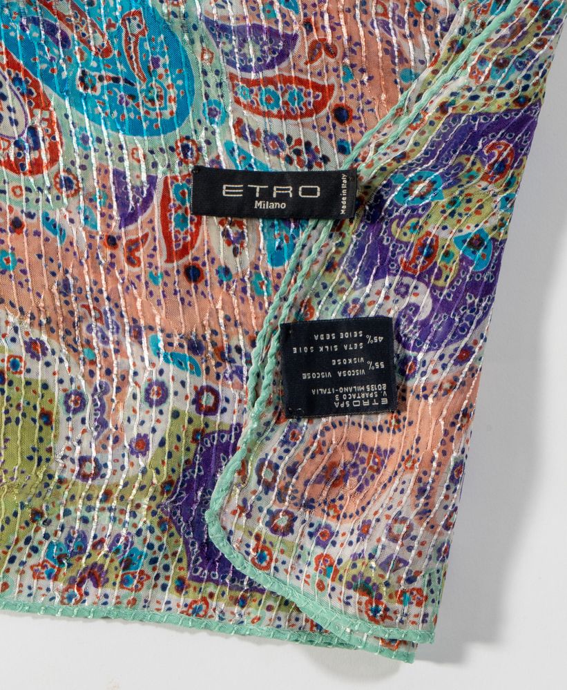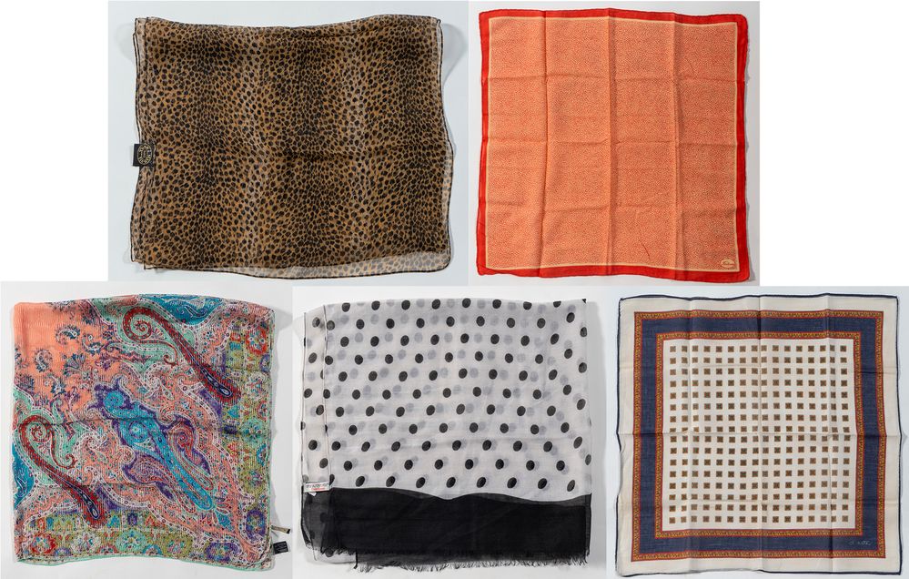 D'ESTE, YVAN&MARZIA PARIS, REGINA SCHRECKER, BORBONESE, ETRO Lotto composto da cinque foulard in seta e viscosa di diversi colori e dimensioni. Rispettivamente di: cm 46x46; cm 36x122; cm 90x180; cm 53x56; cm 135x130. Recano marchi: D'Este, Marzia & Yvan Paris, Regina Schrecker Free time, Borbonese, Etro Milano Made in Italy. (Difetti)