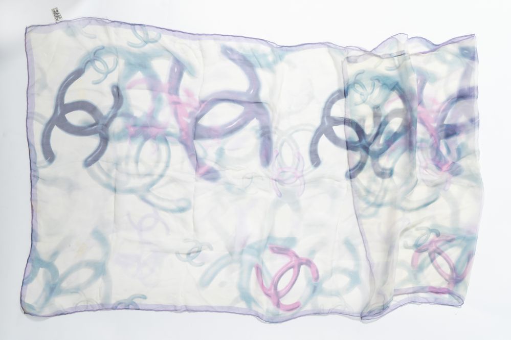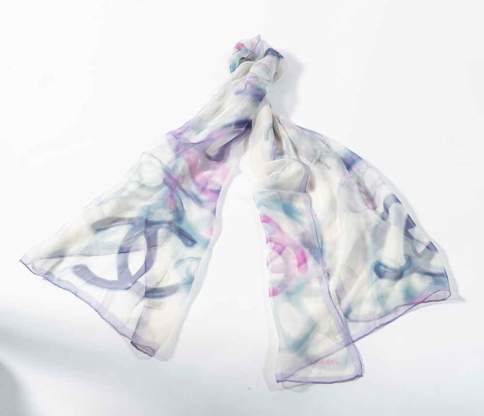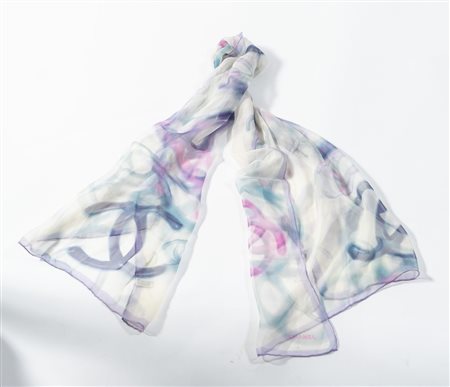 CHANEL Foulard in seta a fantasia CC sui toni del bianco, del viola e dell'azzurro. Cm 65x150. Composizione: 100% seta. Reca marchi CC e Chanel ed etichetta Fabrique en Italie. (Difetti)