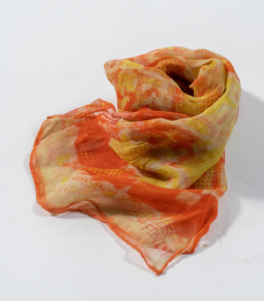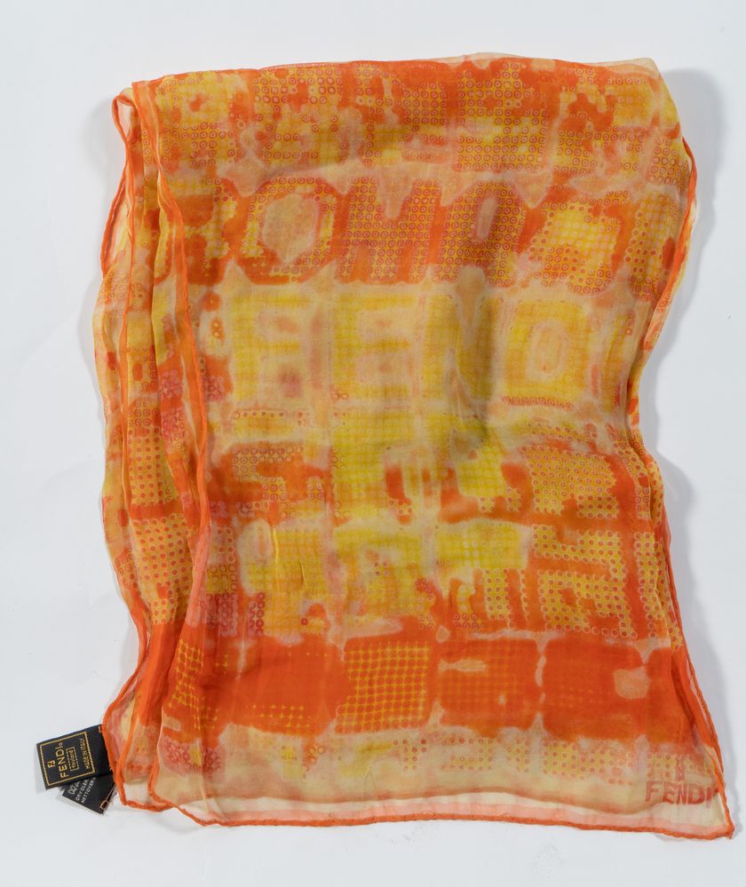 FENDI Foulard in seta a fantasia sui toni dell'arancione e del giallo. Cm 150x30. Composizione: 100% seta. Reca etichetta Fendi Foulard Made in Italy. (Lievi difetti)