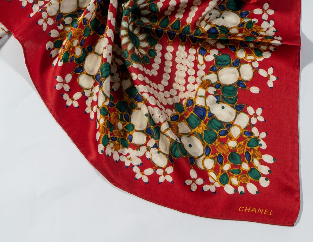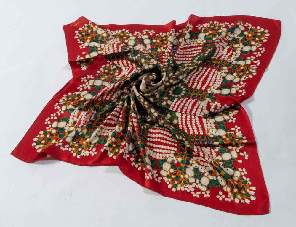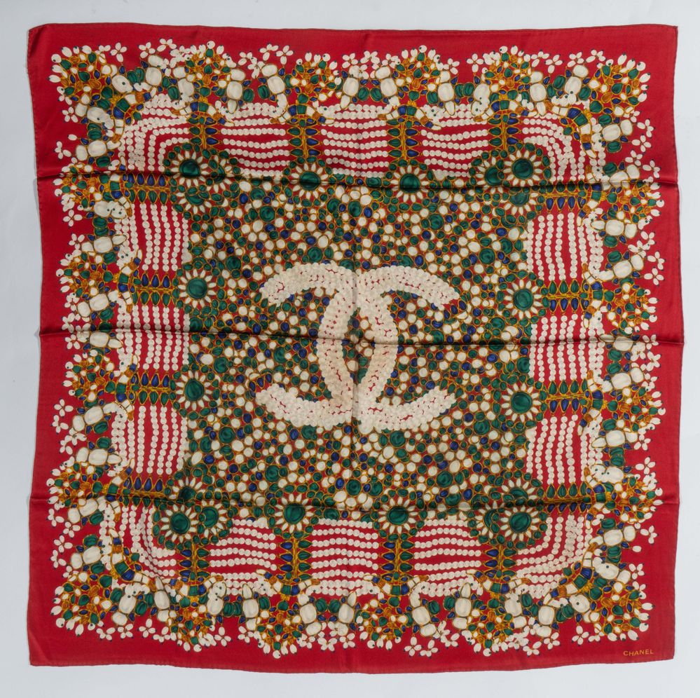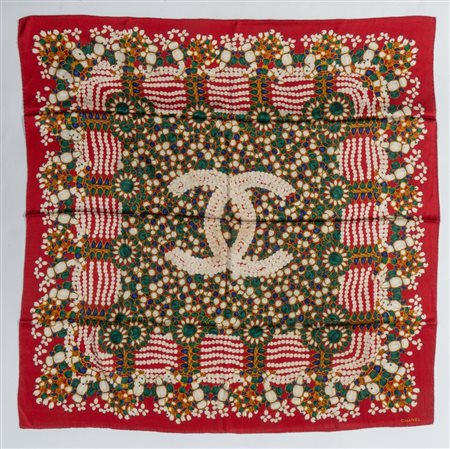 CHANEL Foulard in seta a fantasia di perle e pietre sui toni del rosso, del verde, del blu e del bianco. Cm 97x97. Reca marchi CC e Chanel. (Lievi difetti)