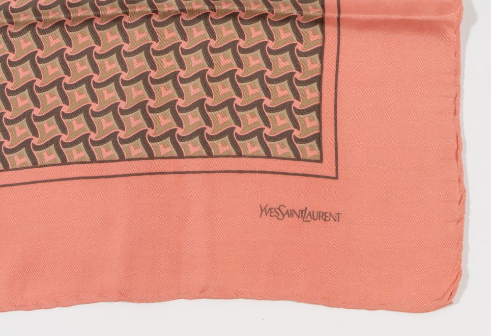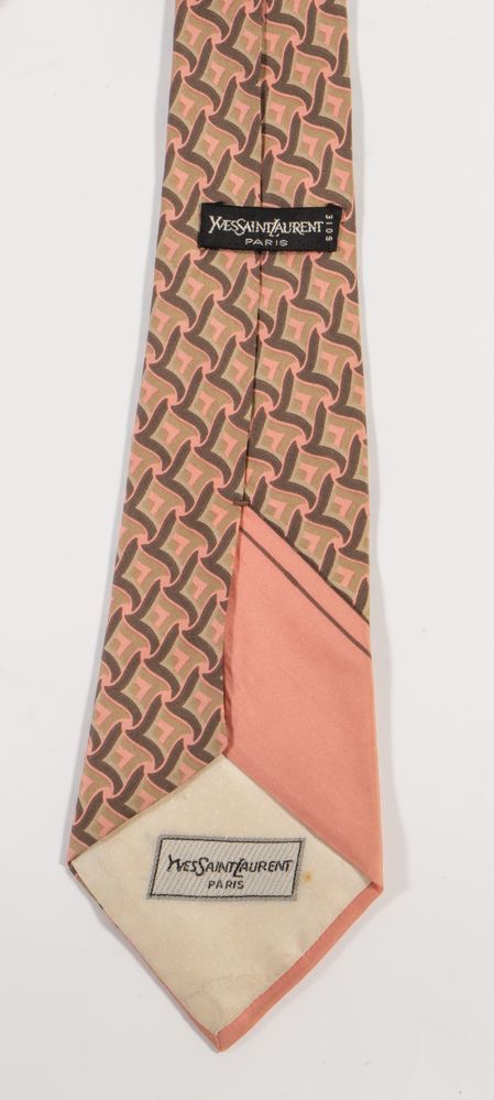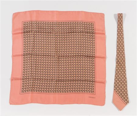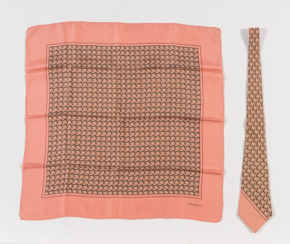 YVES SAINT LAURENT Parure composta da cravatta e foulard in seta a fantasia geometrica sui toni del rosa, del marrone e del verde. Cravatta: lunghezza cm 137. Foulard: cm 66x66. Composizione: 100% seta. Recano marchi ed etichette Yves Saint Laurent Paris, Minarelli Bologna. (Lievi difetti)
