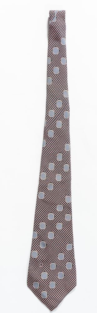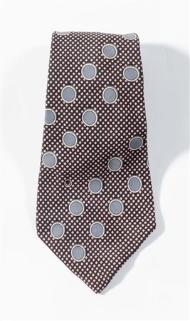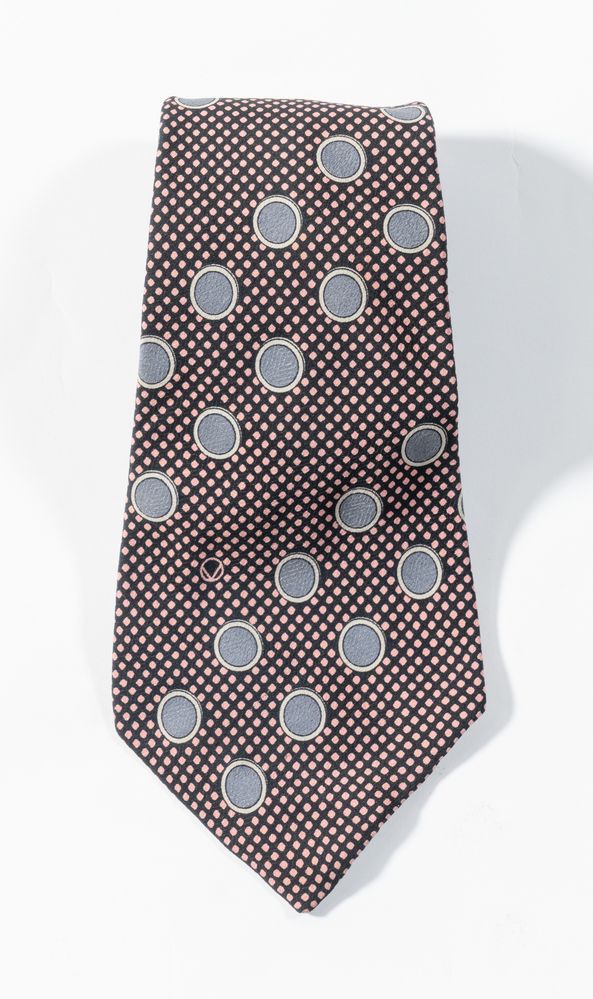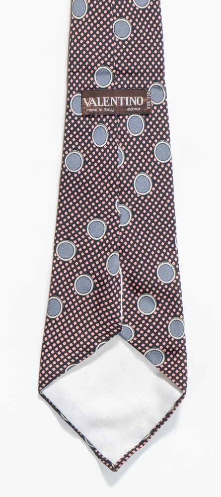 VALENTINO Cravatta in seta a fantasia a pois sui toni del rosa, nero e grigio. Lunghezza cm 147. Composizione: 100% seta. Reca marchi ed etichetta V, Valentino Roma Made in Italy. (Lievi difetti)