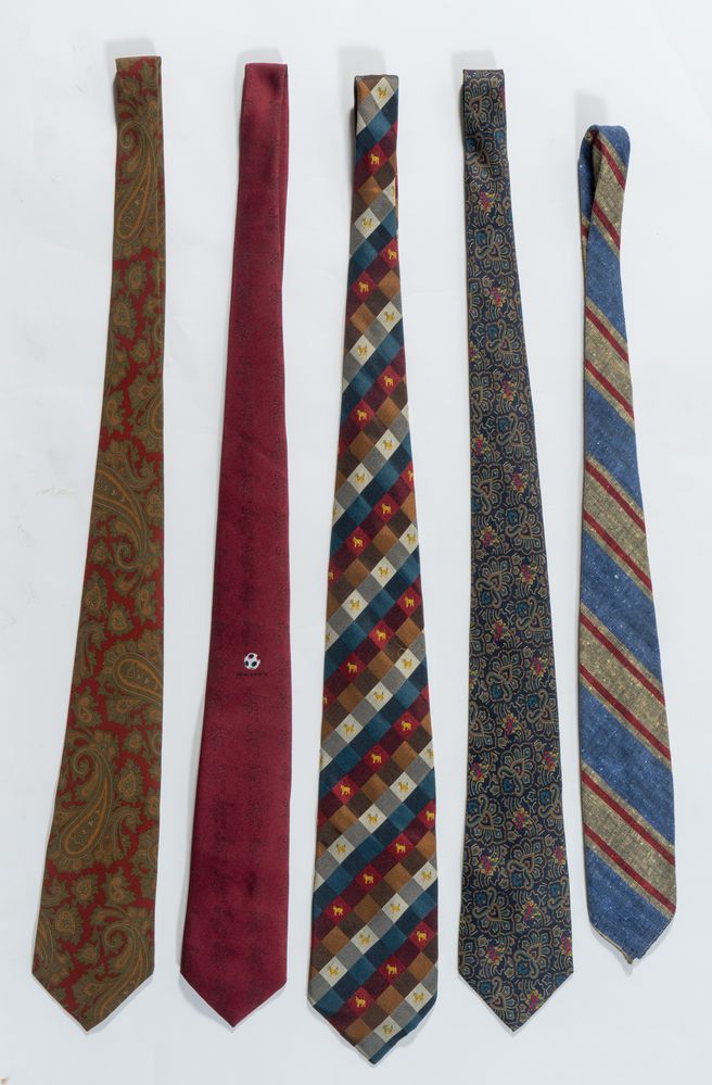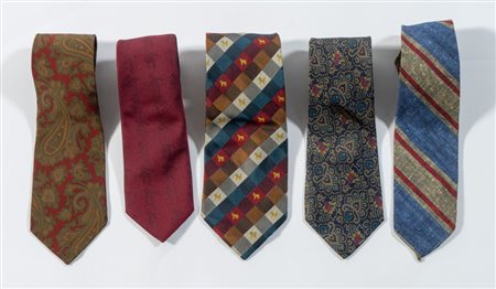GUY LAROCHE, GIANFRANCO VENTURI, CLUB, LONGCHAMP e ISIDE Lotto composto da cinque cravatte in seta e lino di diversi fantasie sui toni del bordeaux, del beige e del blu. Lunghezza cm 133-150. Composizione: 100% seta, 100% lino e 100% poliestere. Recano etichette Guy Laroche Paris, Gianfranco Venturi Made in Italy, Club Cravatte, Longchamp Paris Made in Italy, Iside Italia '90. (Lievi difetti)