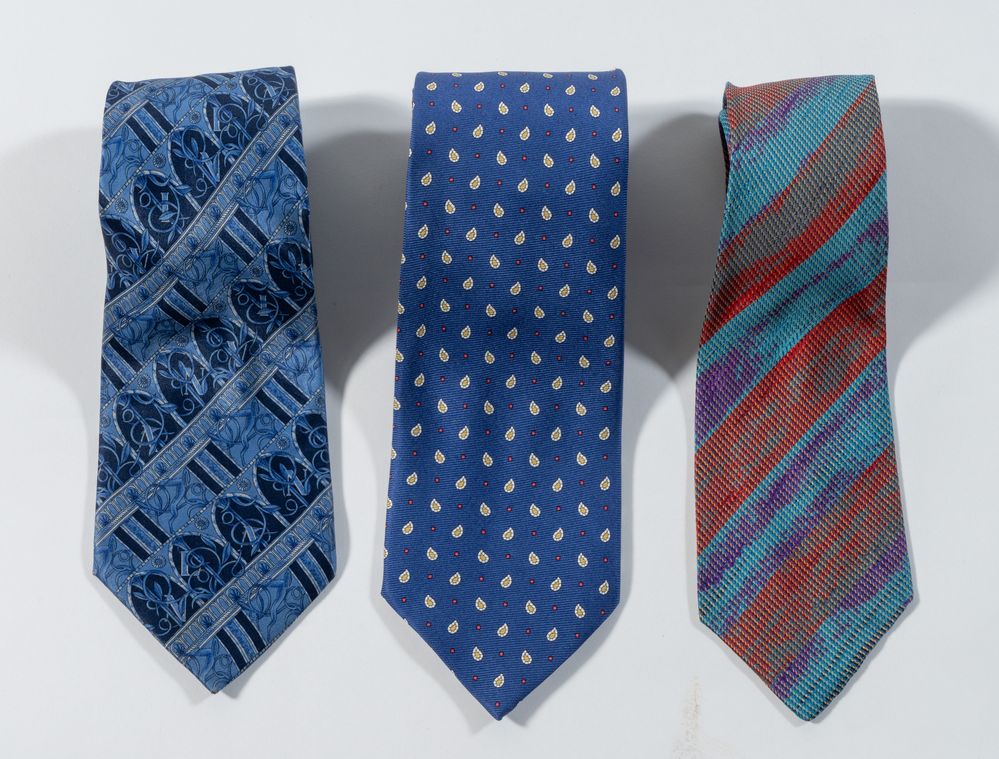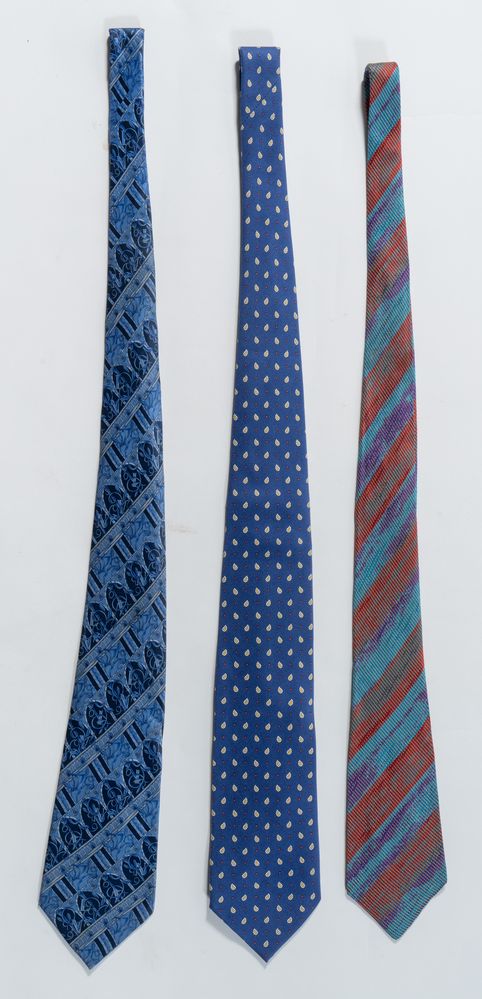 ETRO, MISSONI e LANVIN Lotto composto da tre cravatte in seta a fantasia sui toni del blu, del rosso e del beige. Lunghezza cm 147-152. Composizione: 100% seta. Recano marchi ed etichette Etro Milano Made in Italy, Missoni Cravatte e Lanvin Paris Made in France.