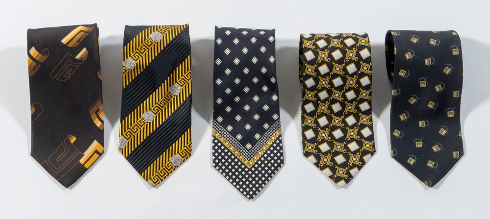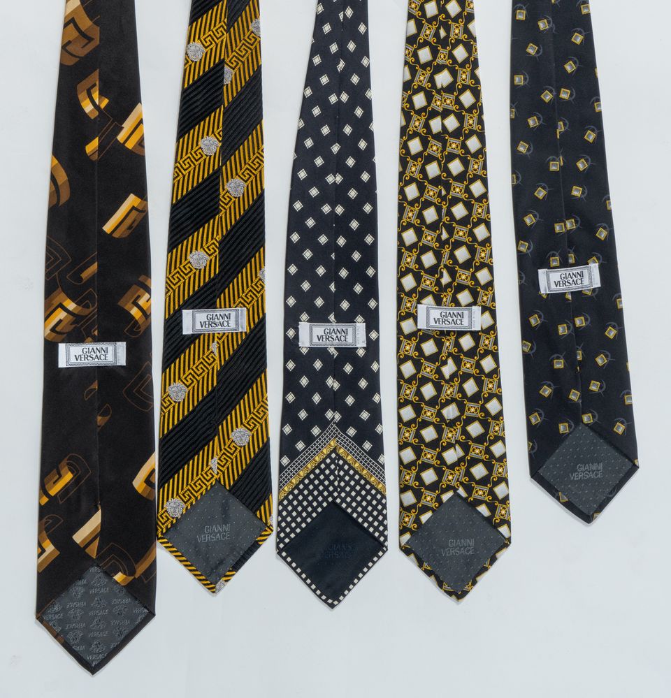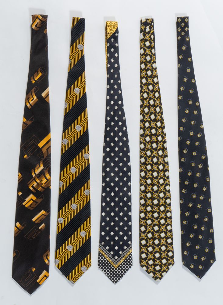 GIANNI VERSACE Lotto composto da cinque cravatte in seta di diversi colori e fantasie geometriche con dettagli barocchi. Lunghezza cm 143-150. Composizione: 100% seta. Recano etichette e marchi Gianni Versace, Versace.