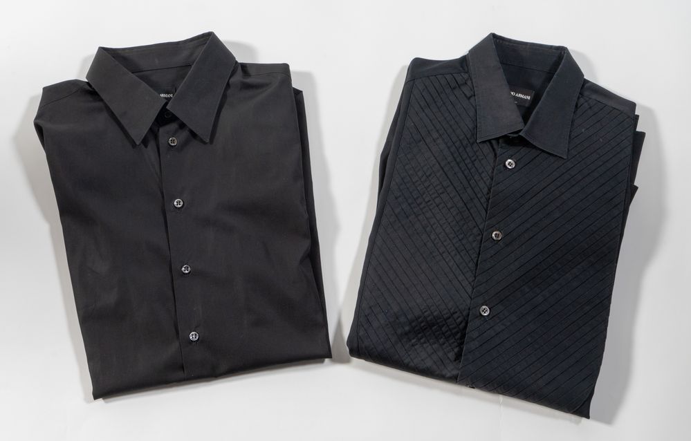 GIORGIO ARMANI Lotto composto da due camicie in cotone nero. Ciascuna riporta taglia 39/15.5. Composizione: 100% cotone. Recano etichette Giorgio Armani Made in Italy. (Lievi difetti)
