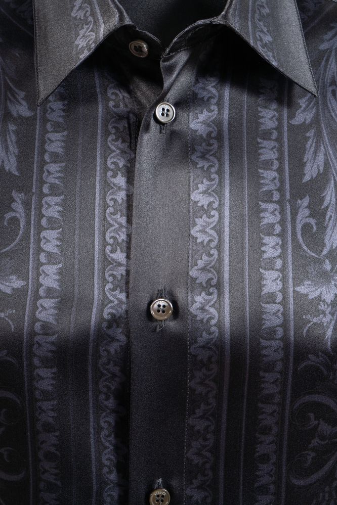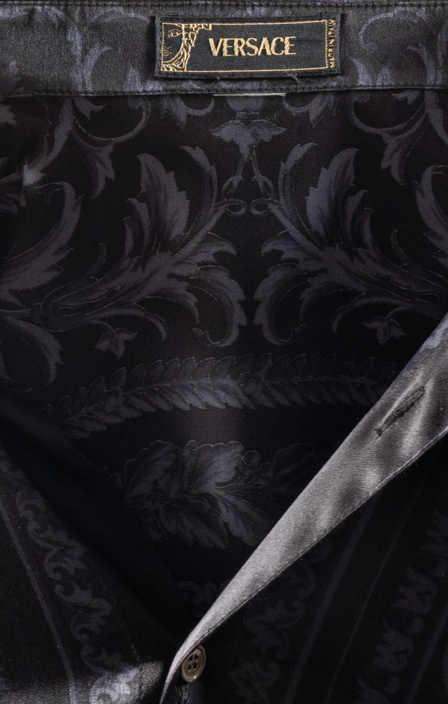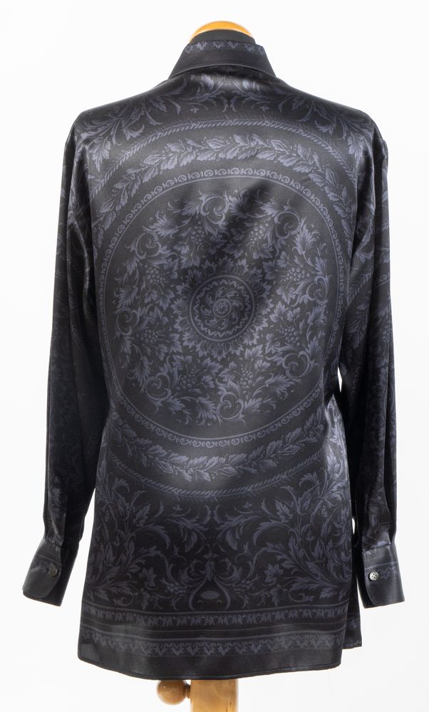 VERSACE Camicia in seta nera con motivo barocco arabescato sui toni del blu....