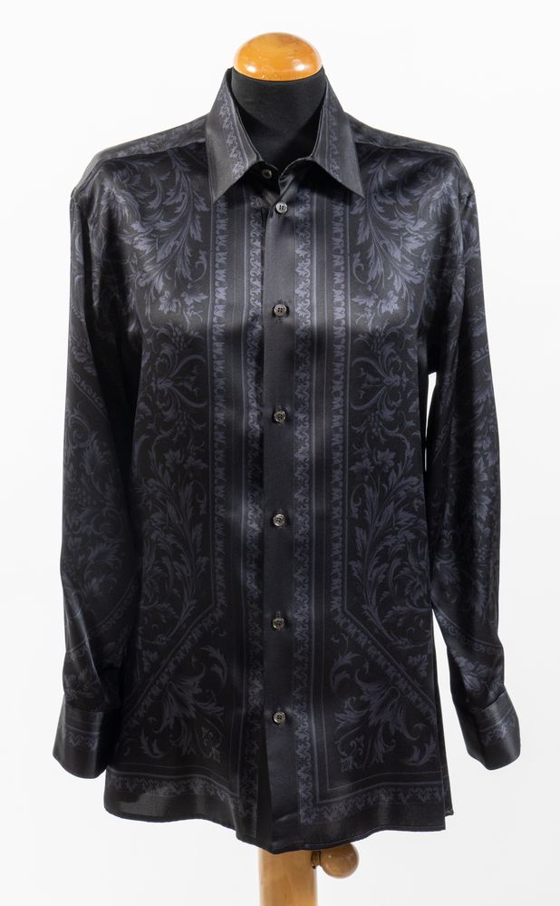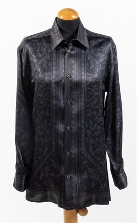 VERSACE Camicia in seta nera con motivo barocco arabescato sui toni del blu. Riporta taglia 46. Reca etichetta Versace Made in Italy. (Lievi difetti)