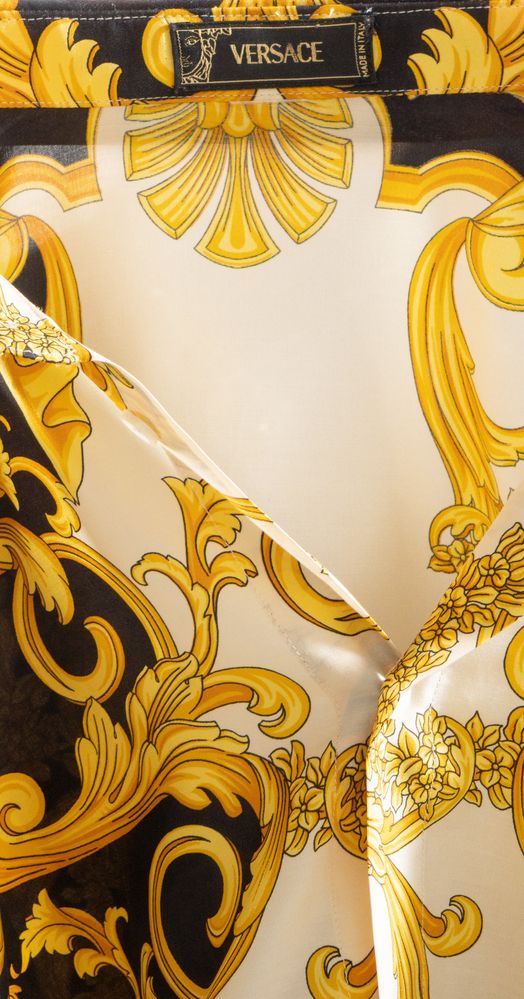 VERSACE Camicia in seta "Chaos Couture" con motivo barocco arabescato sui toni del giallo, del nero e del panna. Riporta taglia IT 46. Reca etichetta Versace Made in Italy. (Lievi difetti)