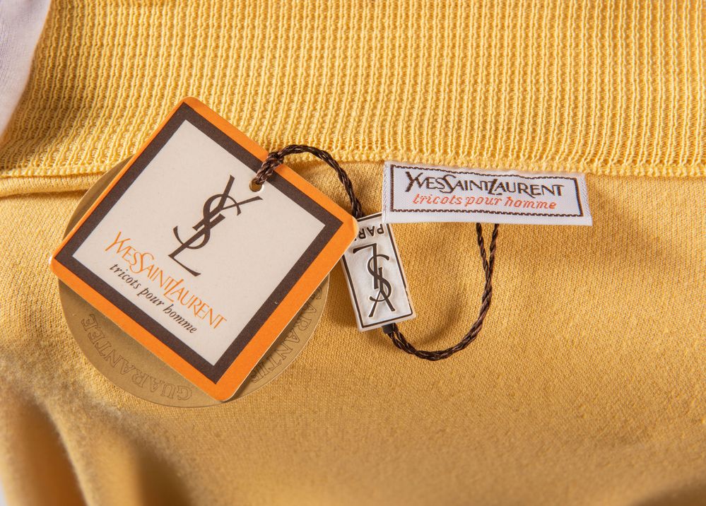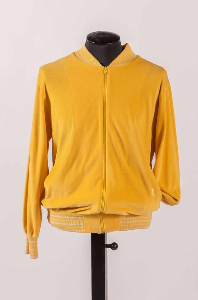 YVES SAINT LAURENT Tricots pour homme Giacca leggera modello bomber in velluto di cotone giallo con logo ricamato e vita e polsi elastici. Riporta taglia 54. Composizione: 84% cotone, 16% poliammide. Reca etichetta Yves Saint Laurent Tricots Pour Homme e cartellini Lineagolf e Yves Saint Laurent con dettagli e specifiche del prodotto. (Lievi difetti)