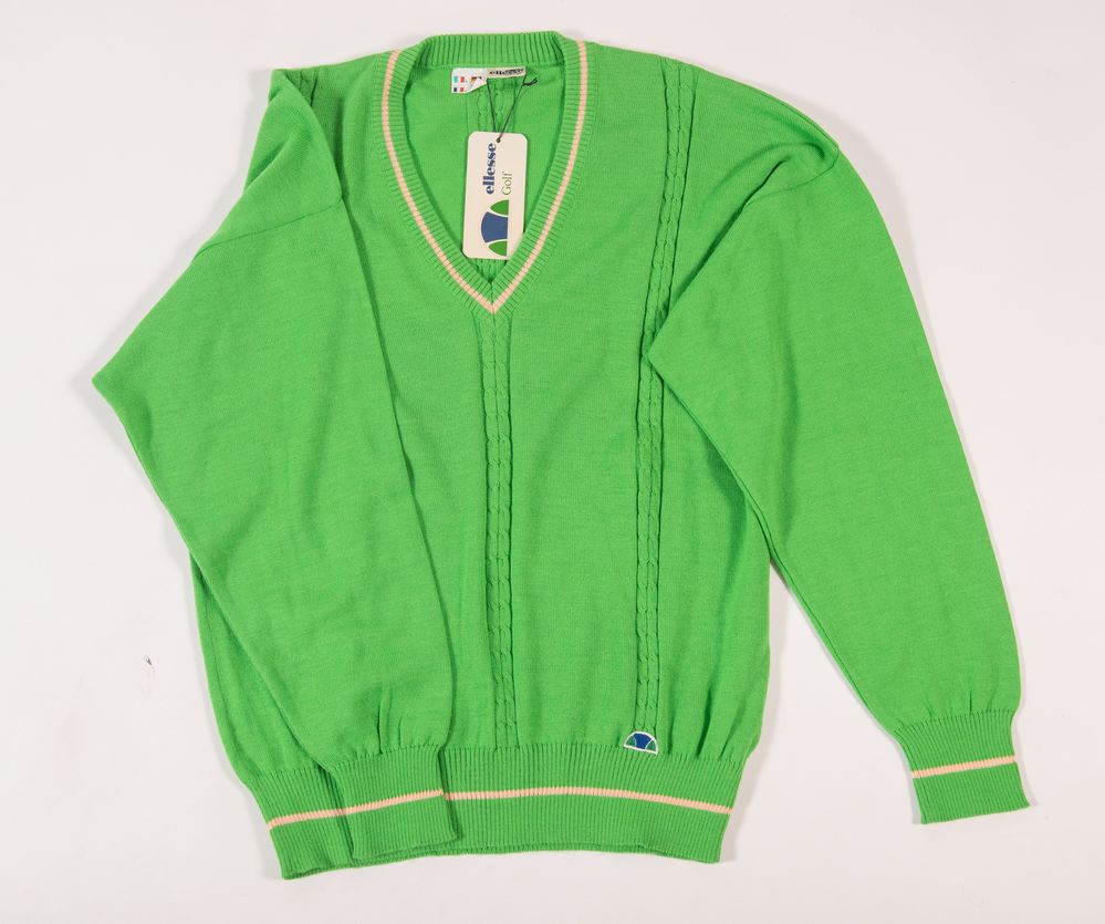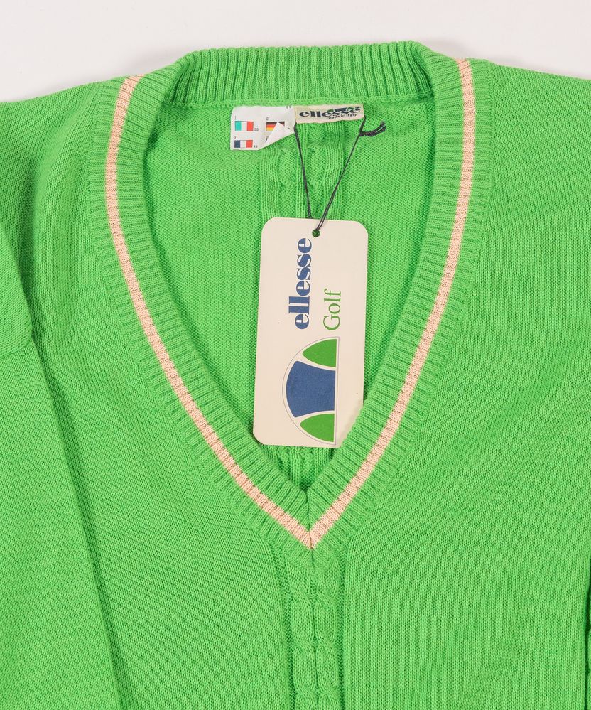 ELLESSE Lotto composto da due maglioni in lana e cotone sui toni del verde, del bianco e dell'azzurro. Riportano taglia 5. Composizioni: 50% lana, 50% acrilico; 100% cotone. Ciascuno reca etichetta Ellesse. Uno è accompagnato da cartellino originale con dettagli e specifiche del prodotto. (Lievi difetti)