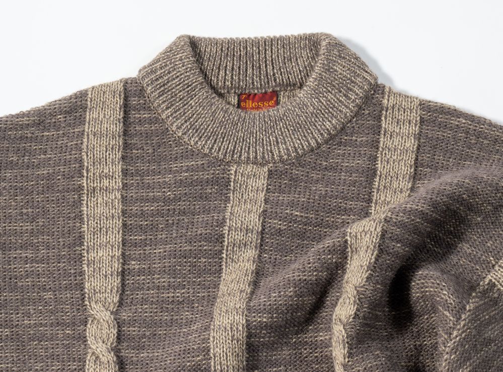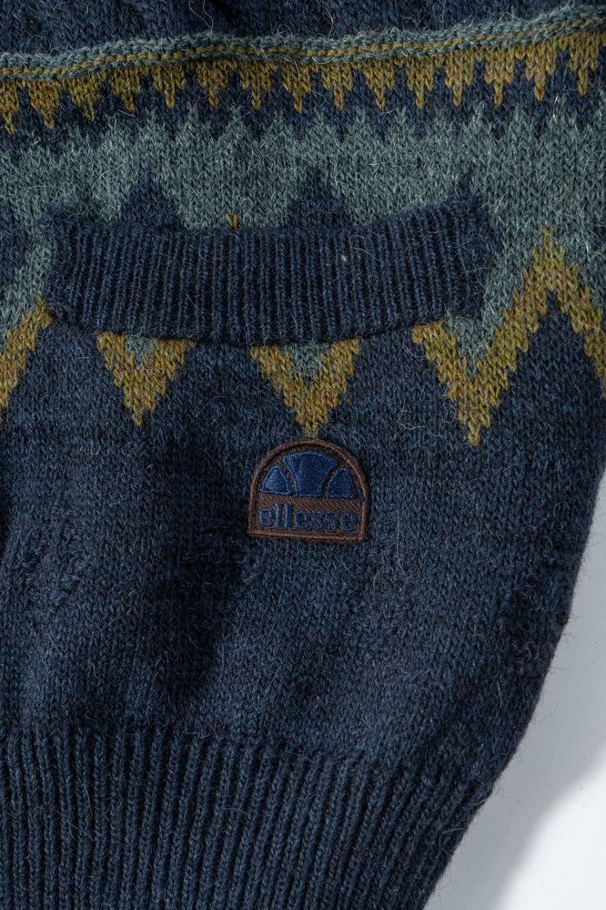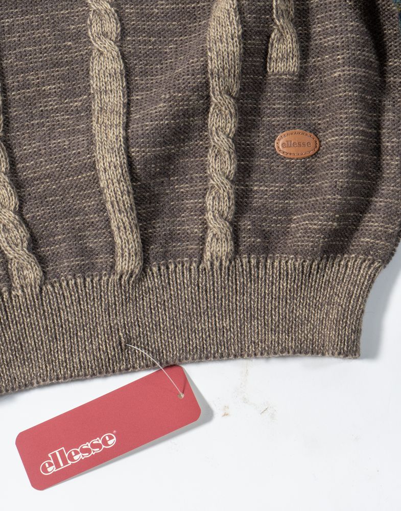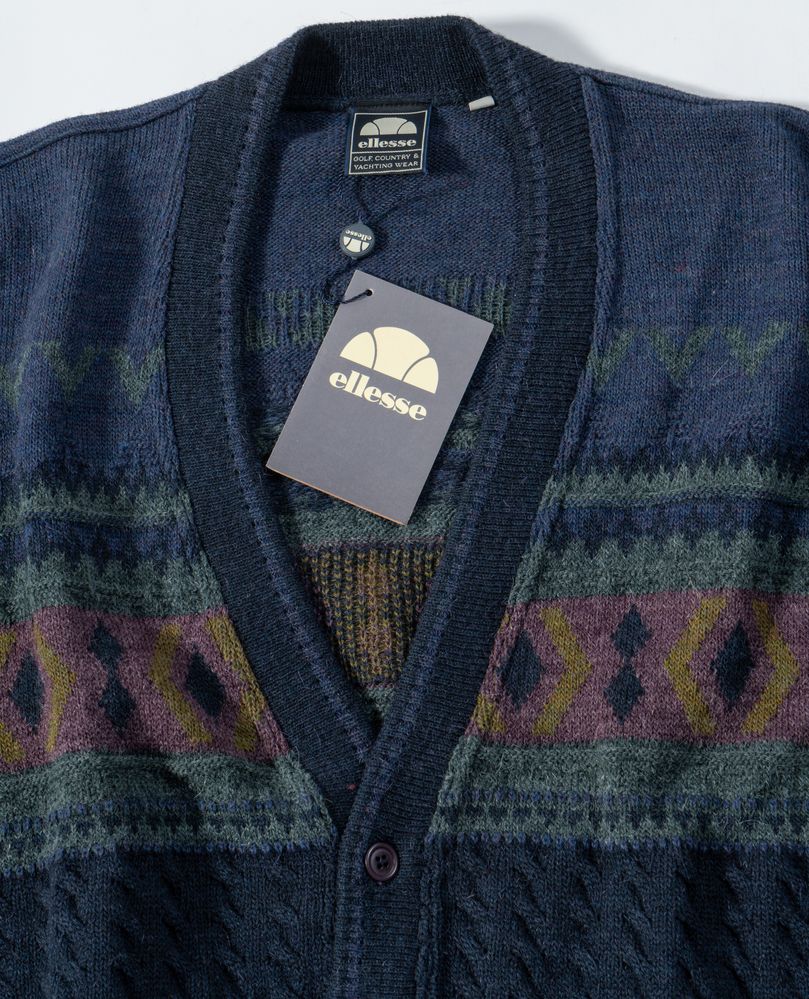 ELLESSE Lotto composto da un cardigan e un maglione maschili in lana sui toni del blu e del marrone. Riportano taglia L e VII. Composizione: 50% acrilico, 25% alpaca e 25% lana; 60% shetland, 10% alpaca, 30% acrilico. Recano marchi ed etichette Ellesse Made in Italy e Ellesse Golf Country & Yachting Wear. Ciascuno è accompagnato da cartellino originale con dettagli e specifiche del prodotto.
