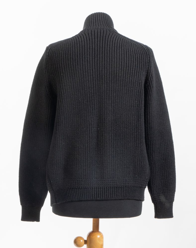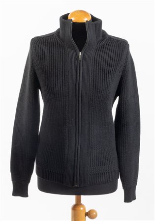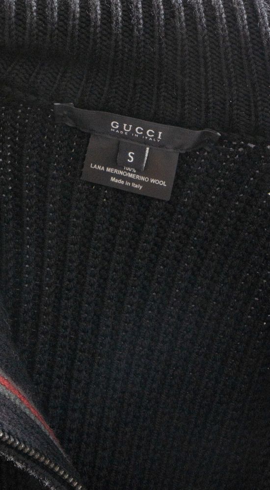 GUCCI Cardigan in lana nera con chiusura lampo. Riporta taglia S. Composizione: 100% lana merino. Reca etichetta Gucci Made in Italy. (Lievi difetti)