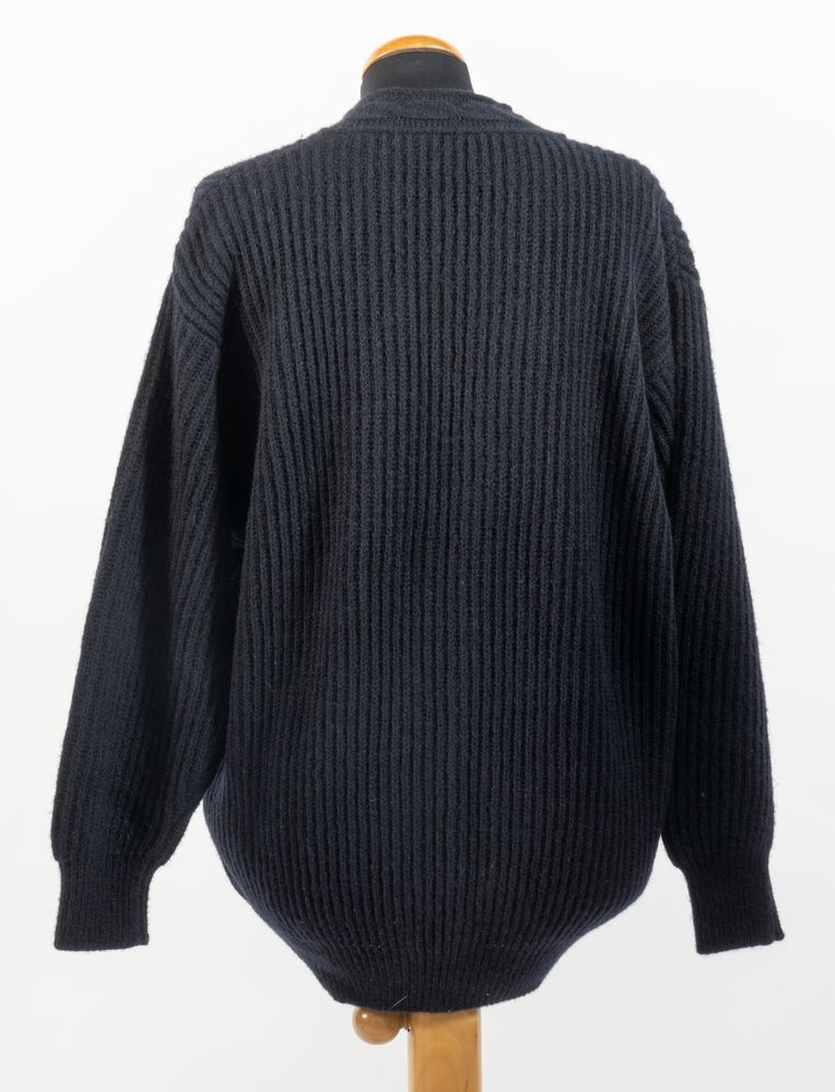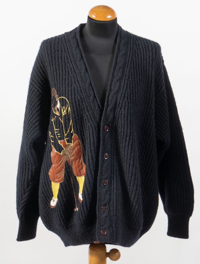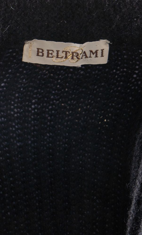 BELTRAMI Cardigan in lana nera con decoro in pelle e lana sul fronte. Riporta taglia S. Composizione: 40% lana merino, 35% superkidmohair e 25% cashmere. Reca etichetta Beltrami Made in Italy. (lievi difetti)