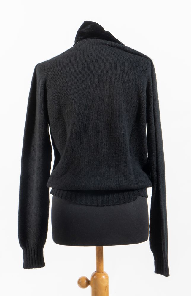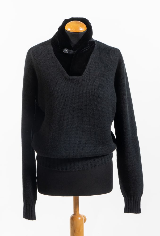 GIORGIO ARMANI Maglione in lana con collo in velluto nero. Riporta taglia 48. Composizione maglione: 100% cashmere. Composizione velluto: 75% viscosa e 25% seta. Reca etichetta Giorgio Armani Made in Italy.