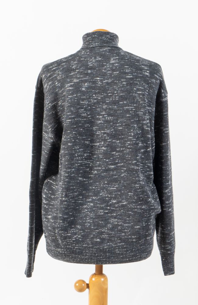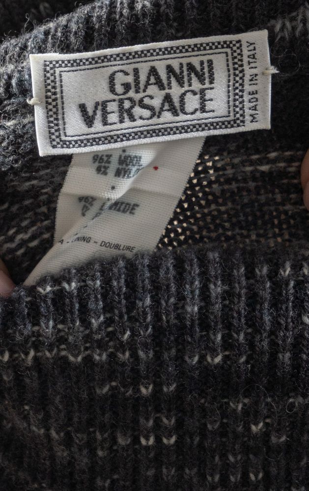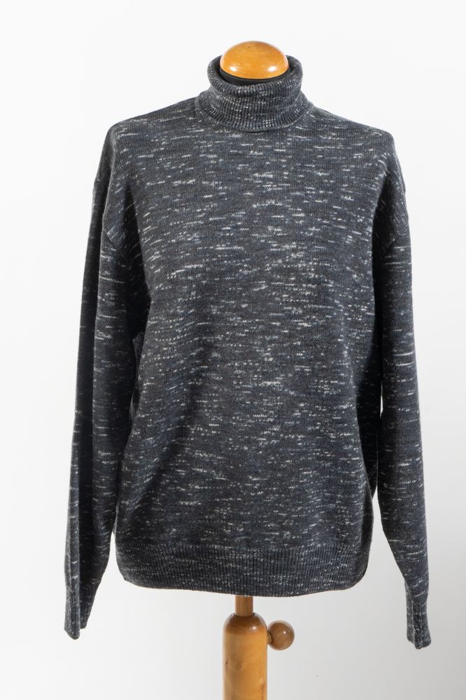 GIANNI VERSACE Maglione a collo alto in lana sui toni del grigio mélange. Riporta taglia 48. Composizione: 96% lana e 4% poliammidica. Reca etichetta Gianni Versace Made in Italy. (Lievi difetti)