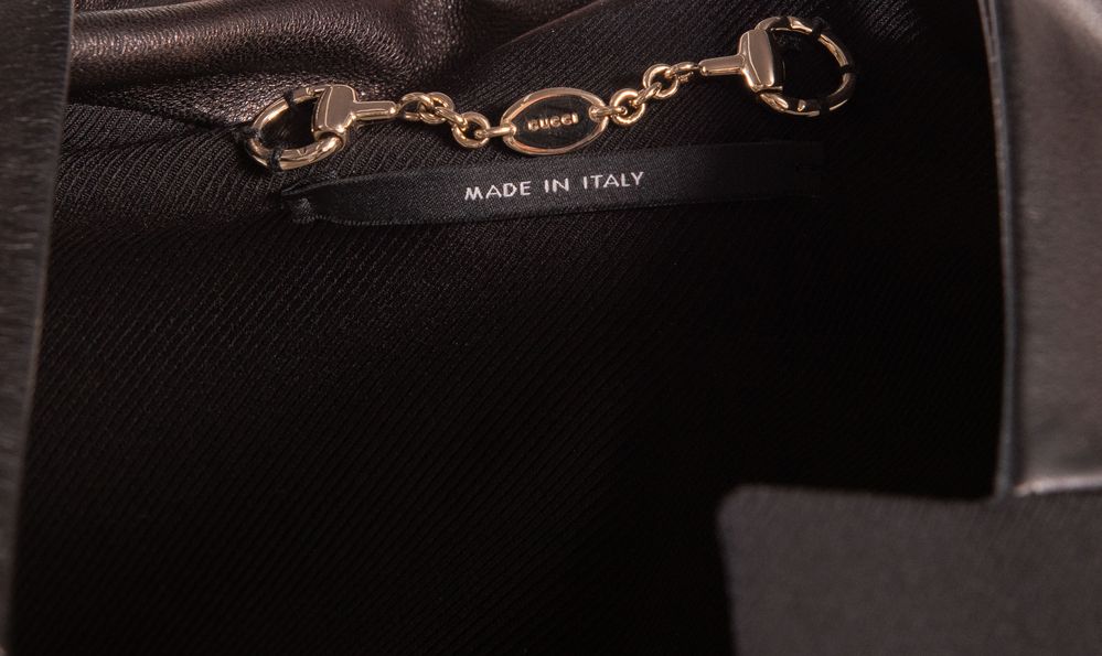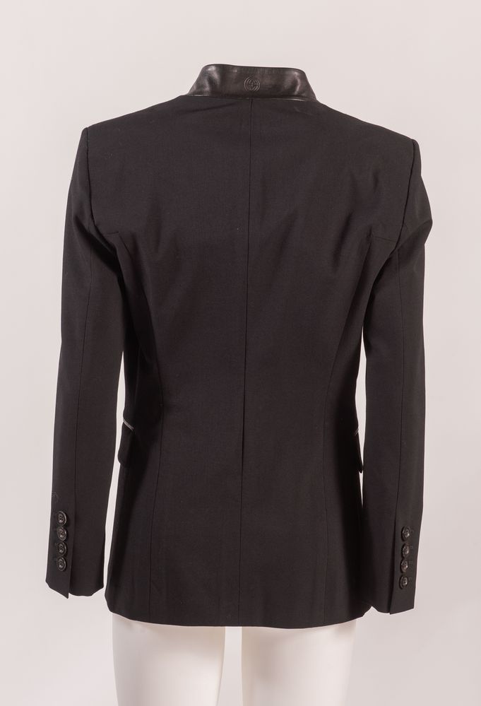 GUCCI Giacca in lana nera con colletto e rifiniture in pelle. Riporta taglia 46. Interno rifinito in tessuto nero. Composizione: 97% lana, 3% elastane. Composizione colletto e rifiniture: 100% pelle. Reca marchio ed etichetta Gucci. Corredata di custodia porta abiti originale.
