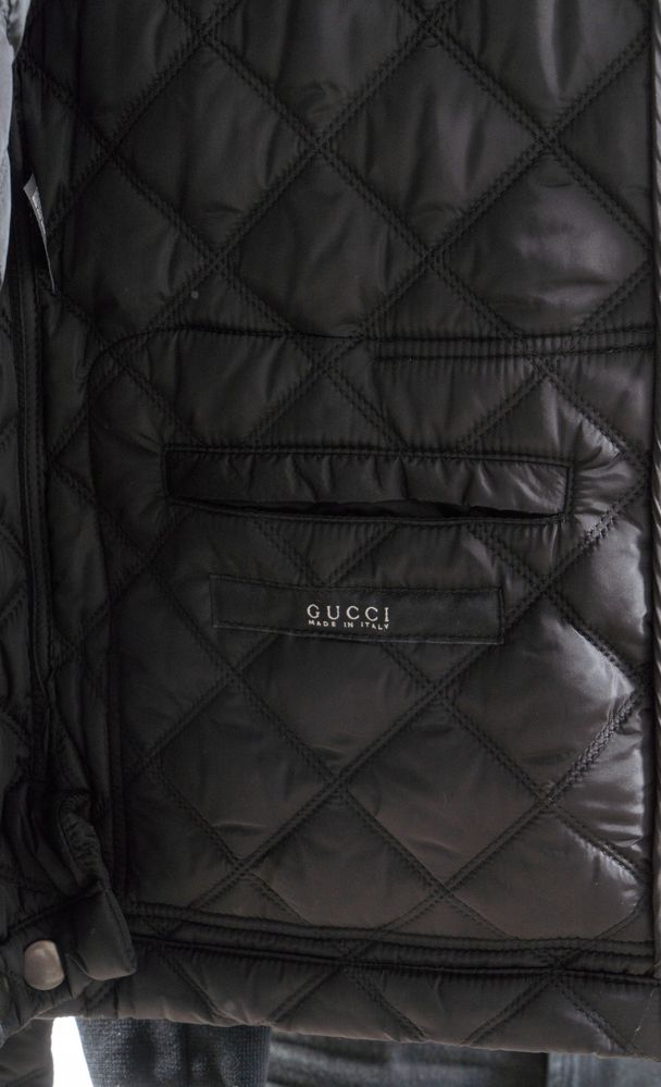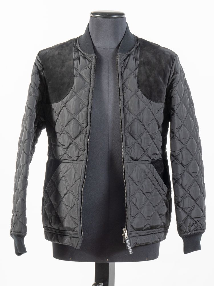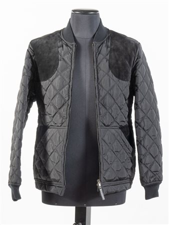 GUCCI Bomber trapuntato imbottito nero con inserti in pelle scamosciata. Riporta taglia 48. Composizione esterno: 99% poliammide e 1% poliuretano. Composizione imbottitura: 100% poliestere. Reca marchi GG e Gucci ed etichetta Gucci Made in Italy. (Lievi difetti)