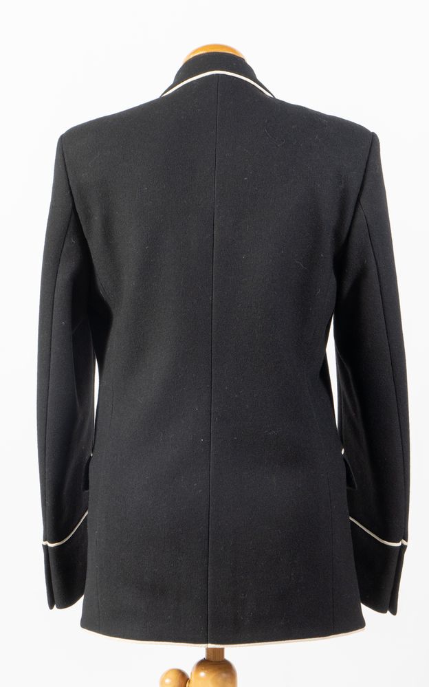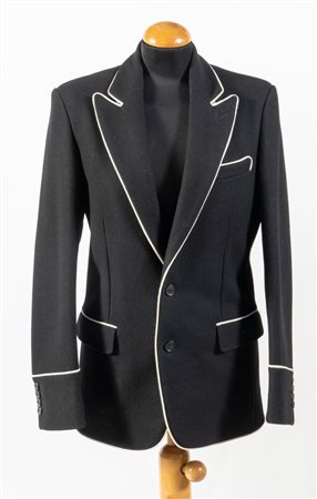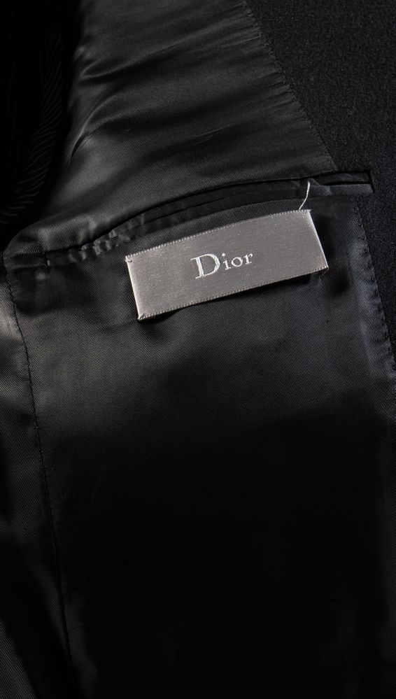 DIOR Giacca in lana con rifiniture bianche. Riporta taglia 46. Composizione esterno: 75% lana, 20% poliammide e 5% cashmere. Composizione fodera interna: 100% cupro. Reca etichette Dior, Paris. (Lievi difetti)