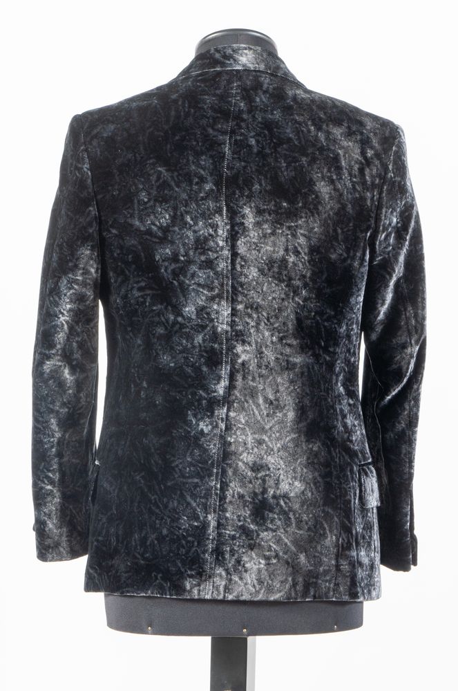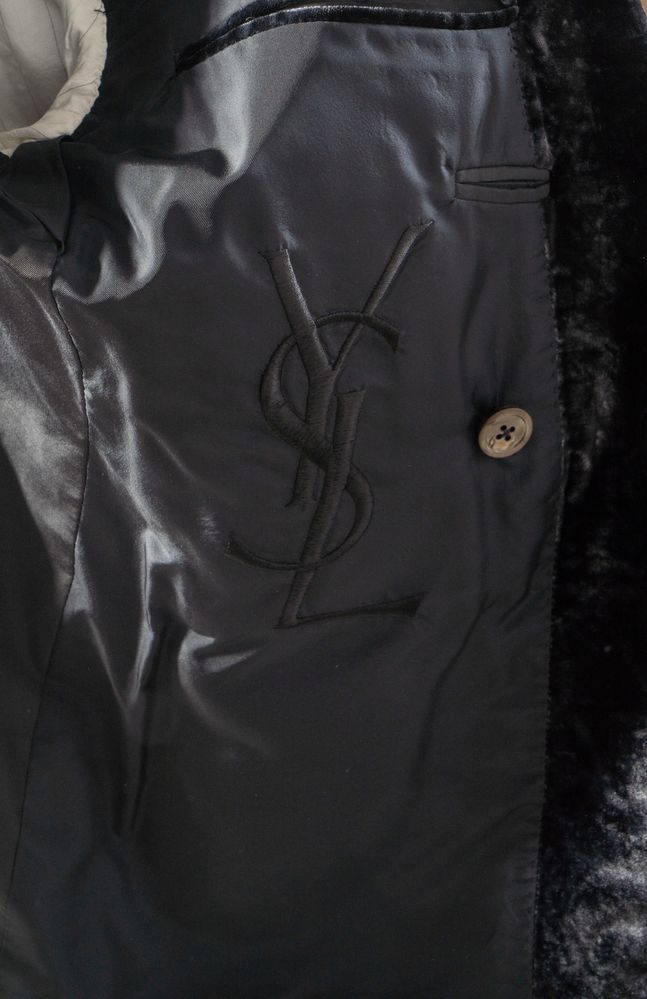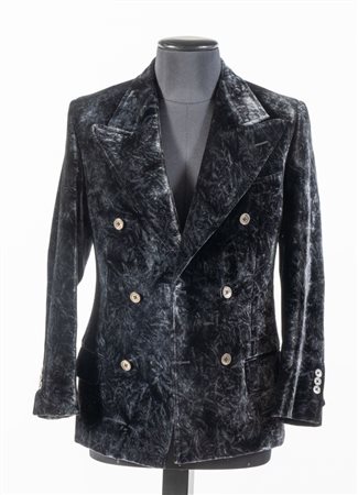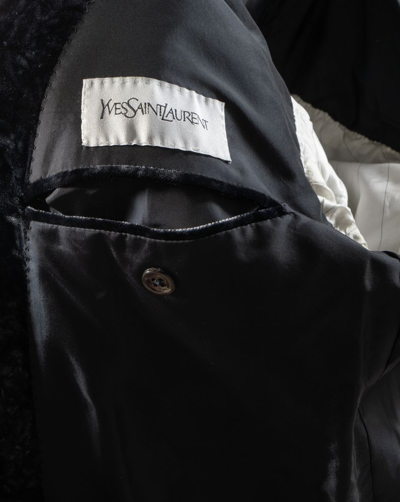 YVES SAINT LAURENT Giacca a doppiopetto in velluto cangiante nero. Riporta taglia 46. Composizione esterno: 100% cupro. Composizione fodera interna: 100% cupro. Reca marchio YSL ed etichetta Yves Saint Laurent.