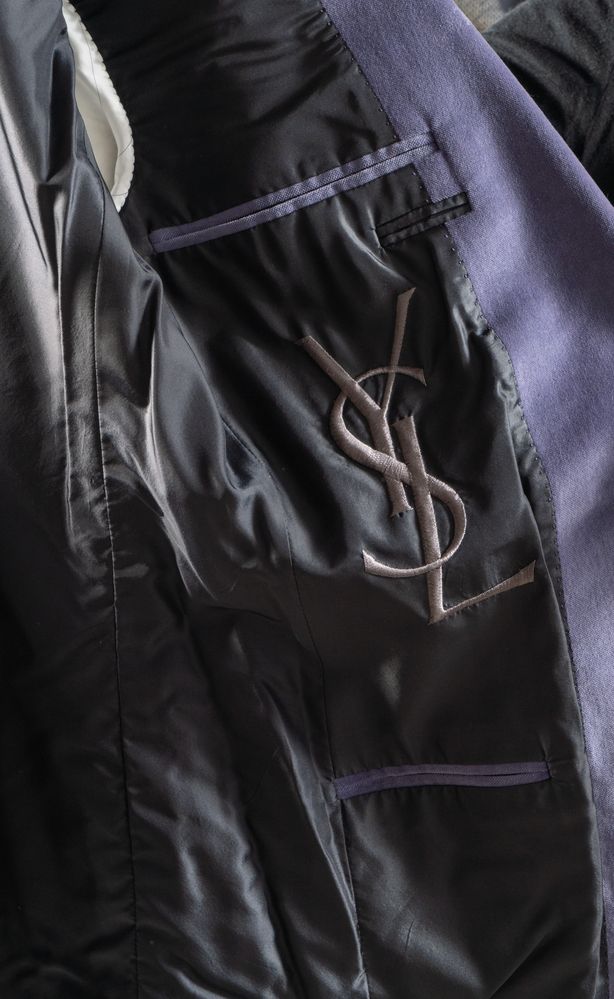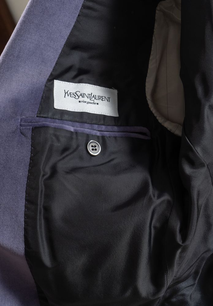 YVES SAINT LAURENT Rive Gauche Giacca in velluto viola. Riporta taglia 46. Composizione esterno: 100% cotone. Composizone fodera interna: 100% cupro. Reca marchio YSL ed etichetta Yves Saint Laurent Rive Gauche.