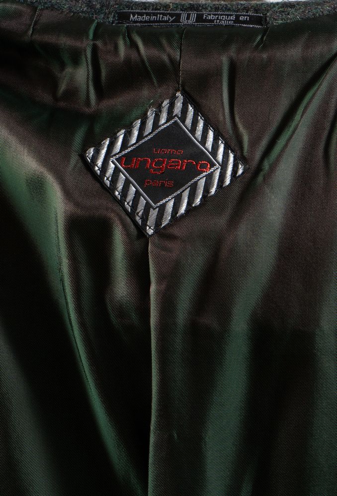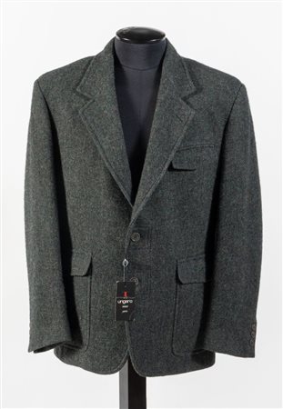 UNGARO Giacca maschile in lana mélange sui toni del verde e del grigio. Riporta taglia 48. Interno rifinito con fodera cangiante verde. Composizione esterno: 100% lana. Composizione fodera interna: 61% acetato e 39% rayon. Reca etichette Ungaro e Made in Italy Fabriqué en Italie. Accompagnato da cartellino originale con dettagli e specifiche del prodotto.