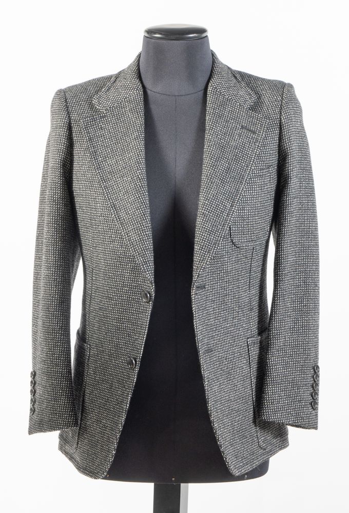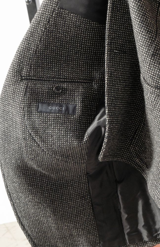 GUCCI Giacca in lana a fantasia sui toni del grigio e del nero. Riporta taglia 46. Composizione esterno: 100% lana. Composizione fodera interna: 100% cupro. Reca etichetta Gucci.