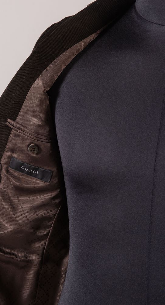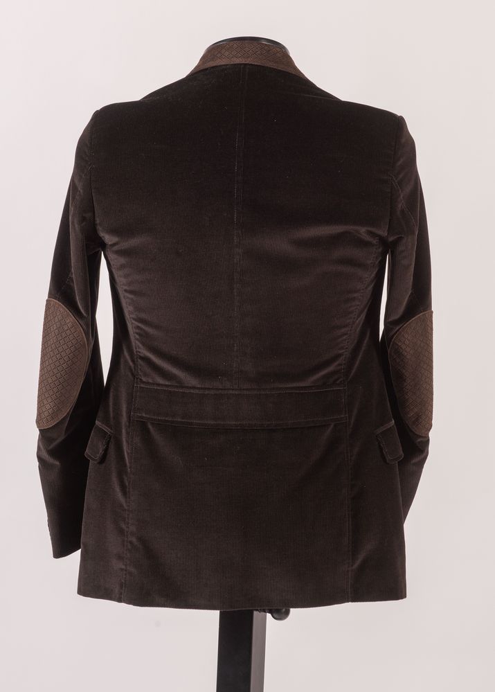 GUCCI Giacca in velluto di cotone marrone con rifiniture in pelle scamosciata. Riporta taglia 44. Interno rifinito in tessuto sintetico marrone. Composizione esterno: 100% cotone. Composizione fodera interna: 100% cupro. Reca etichetta Gucci. Corredata di bottoni, pezzo di stoffa di ricambio e custodia porta abiti originale.