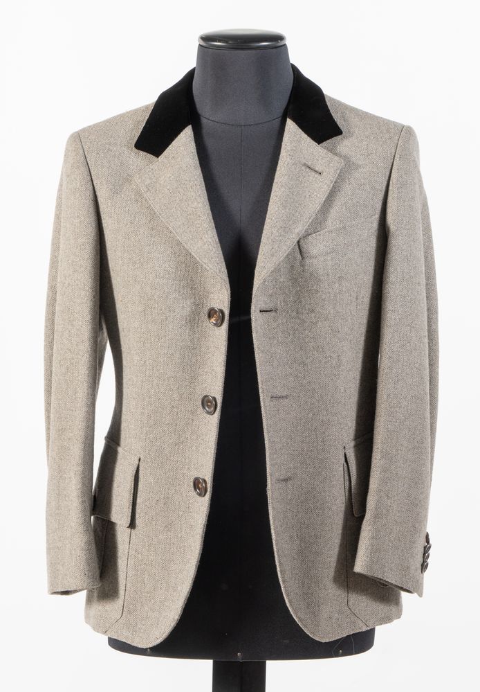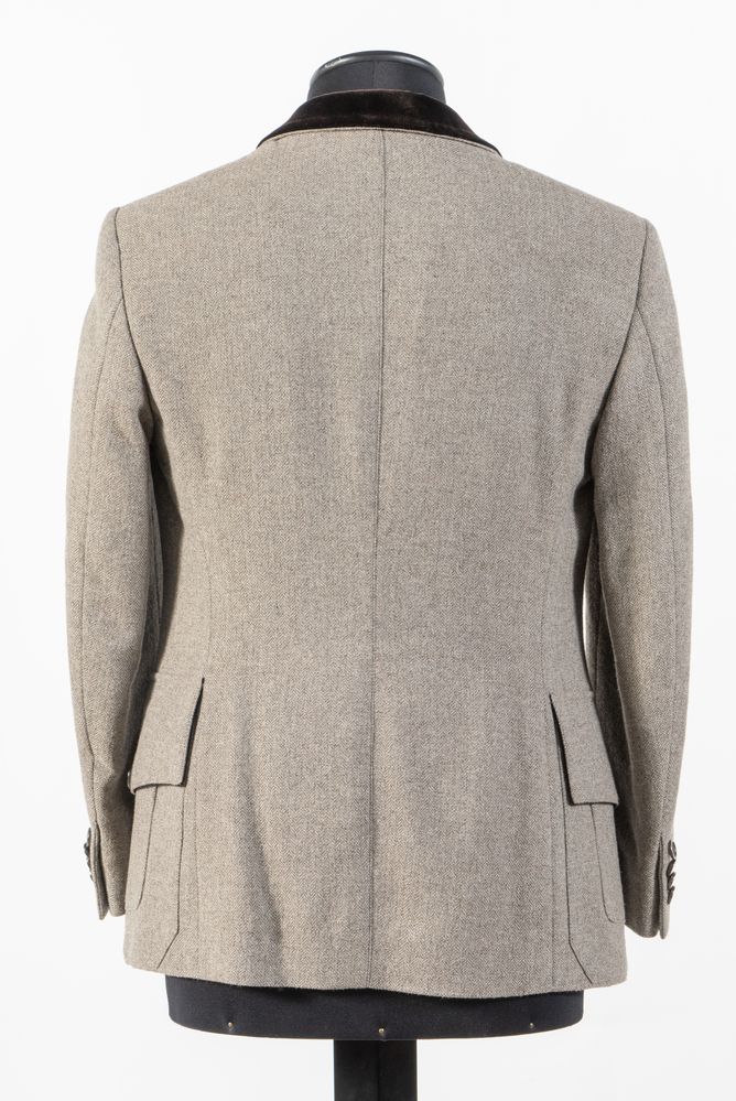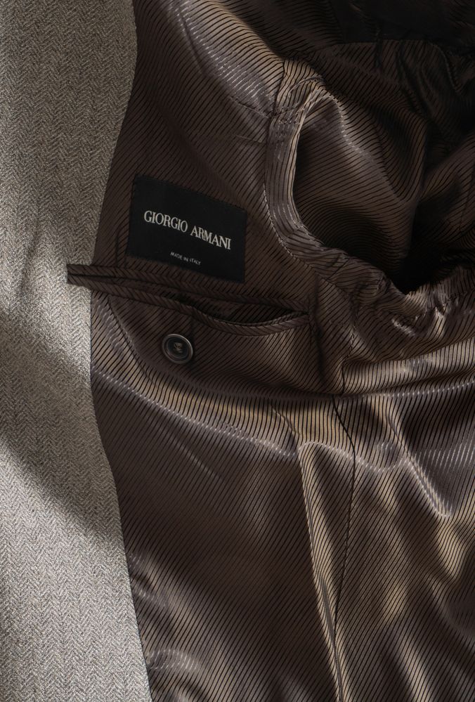 GIORGIO ARMANI Giacca in lana spinata sui toni del beige con dettaglio del colletto in velluto marrone. Riporta taglia 46. Composizione esterno: 45% lana, 40% acetato e 15% poliammide. Corredato di bottoni originali di ricambio. Reca etichetta Giorgio Armani Made in Italy.