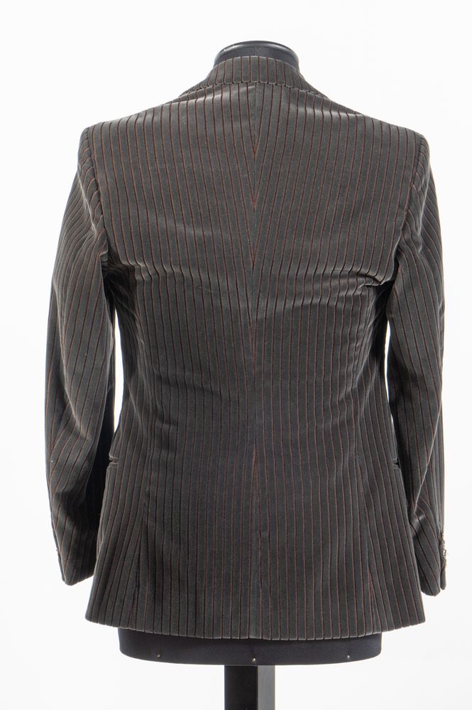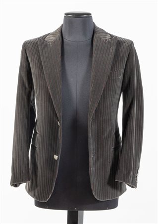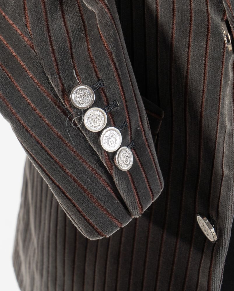 HERMÈS Giacca in velluto gessato sui toni del grigio e del marrone con bottoni in metallo argentato e logato. Riporta taglia 48. Composizione esterno: 100% cotone. Composizione fodera interna: 100% rayon. Reca marchi ed etichetta Hermès.