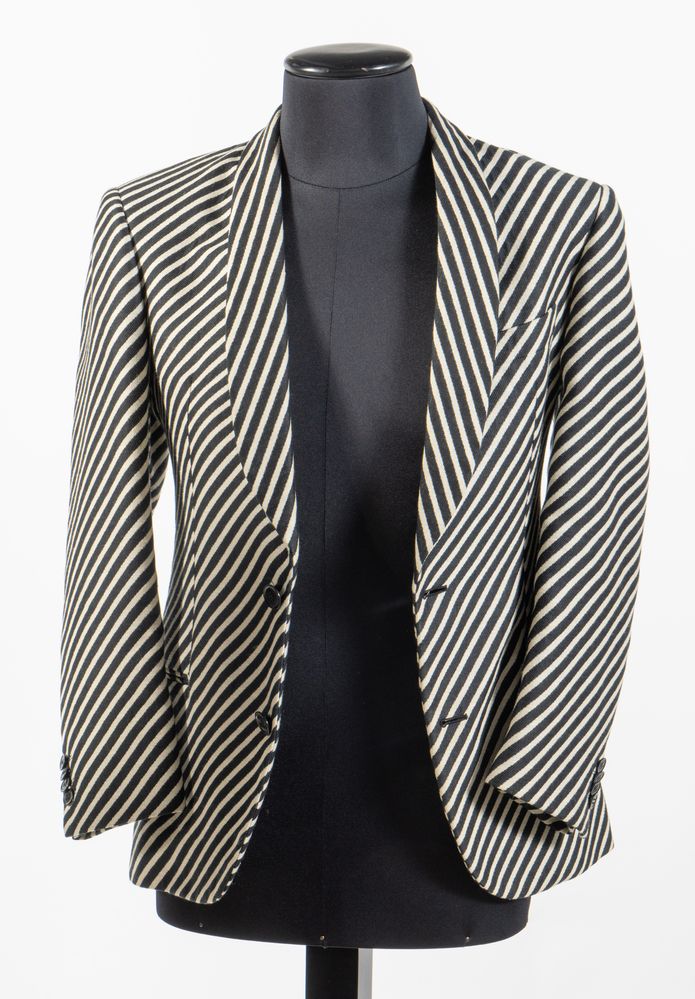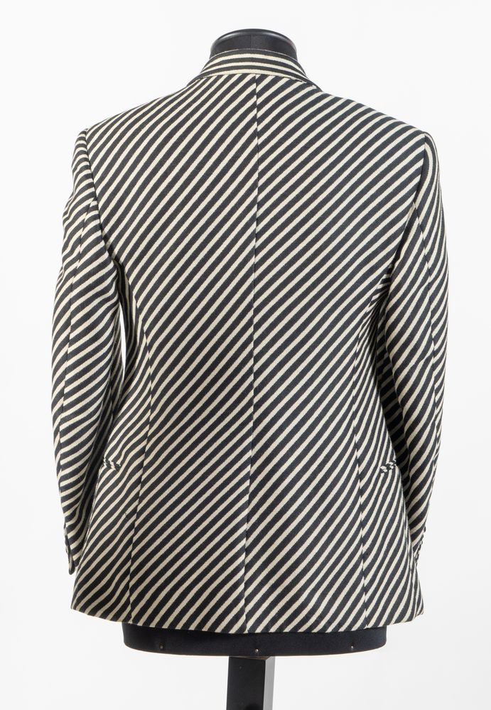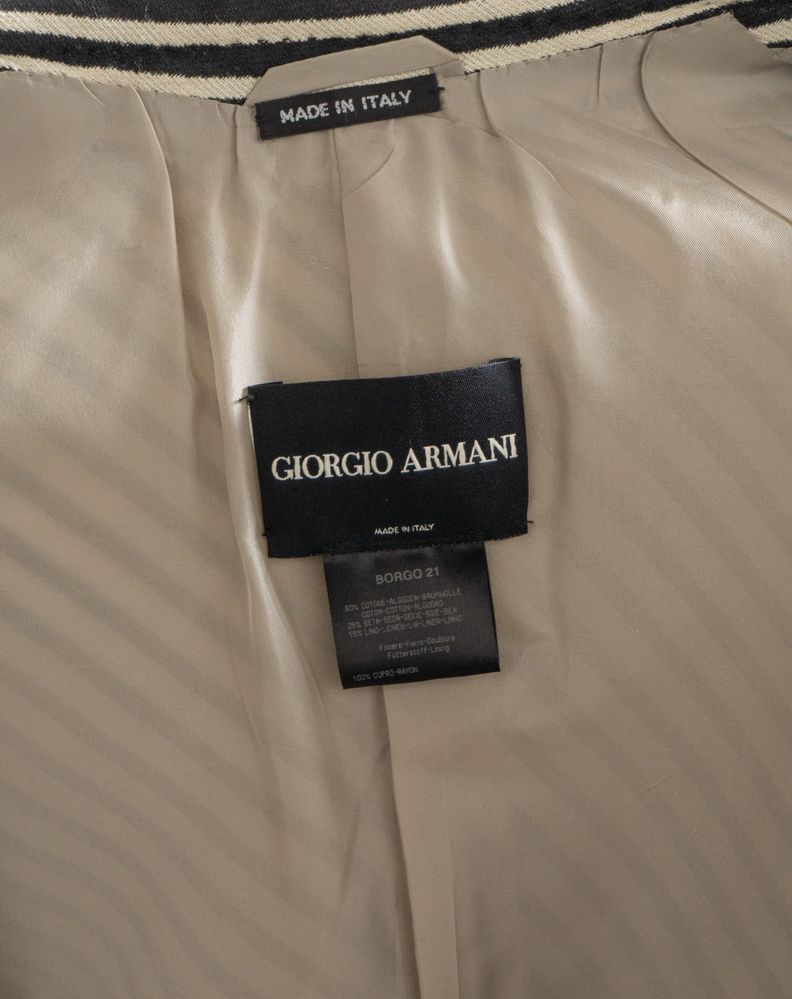 GIORGIO ARMANI Giacca in misto cotone a righe bianche e nere. Taglia non riportata. Composizione esterno: 60% cotone, 25% seta e 15% lino. Composizione fodera interna: 100% cupro. Reca etichetta Giorgio Armani, Made in Italy. (Lievi difetti)