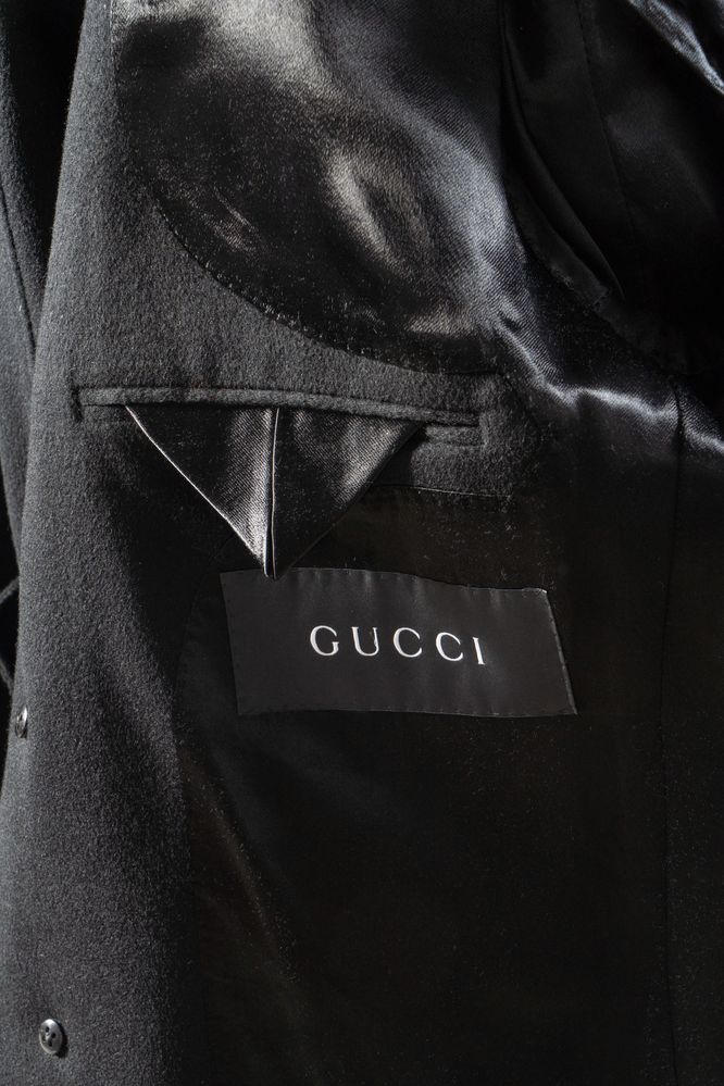 GUCCI Cappotto lungo maschile in lana nera con bottoni logati in metallo. Riporta taglia 46. Composizione esterno: 100% lana. Composizione fodera interna: 60% cupro e 40% cotone. Reca etichetta Gucci. Corredato di pezzo di stoffa e due bottoni di ricambio originali.