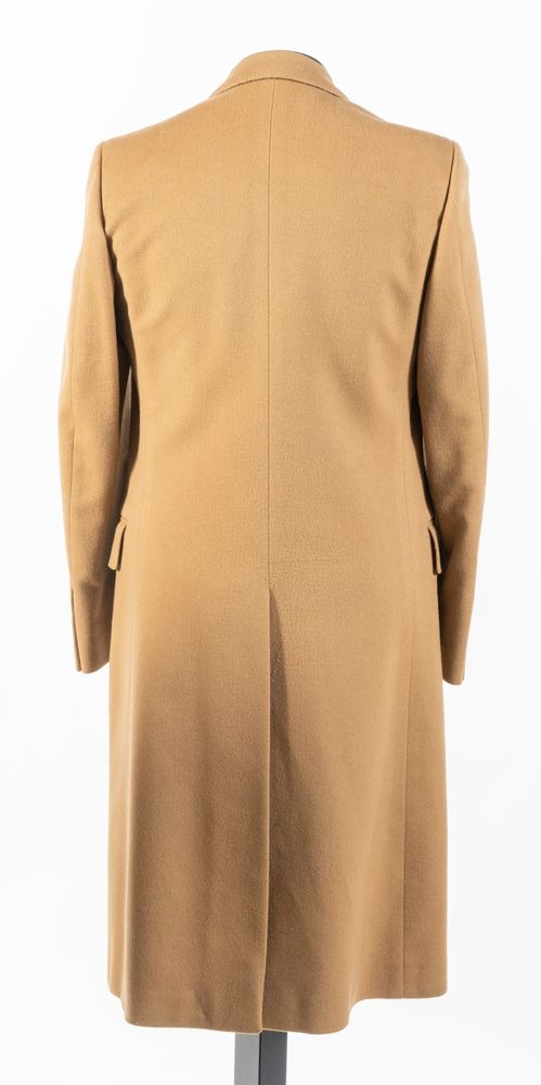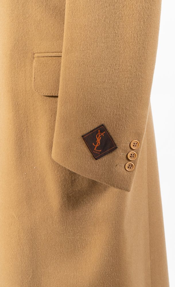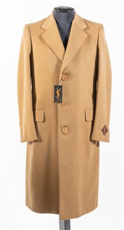 YVES SAINT LAURENT Diffusion Homme Cappotto maschile in lana e cashmere beige. Riporta taglia 48. Interno rifinito con fodera logata beige. Composizione esterno: 80% lana e 20% cashmere. Composizione fodera interna: 100% cupro. Reca marchi YSL ed etichetta Yves Saint Laurent. Accompagnata da cartellino originale con dettagli e specifiche del prodotto.