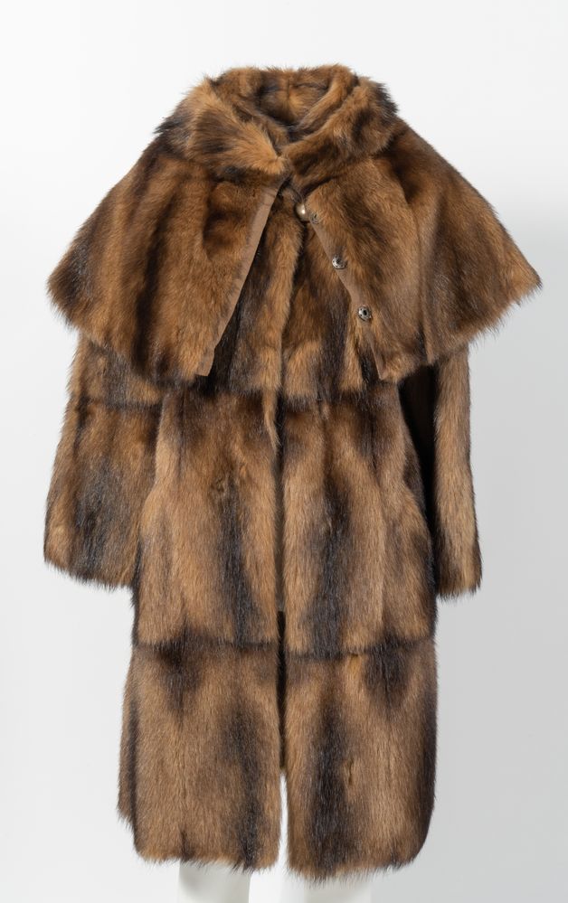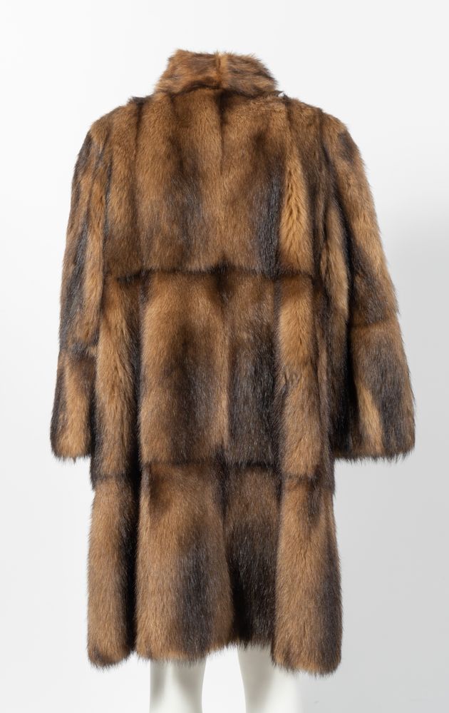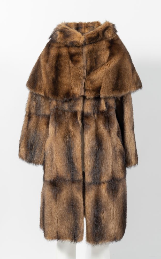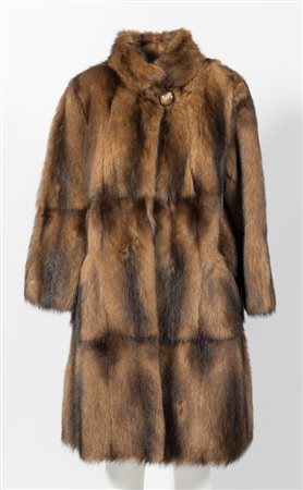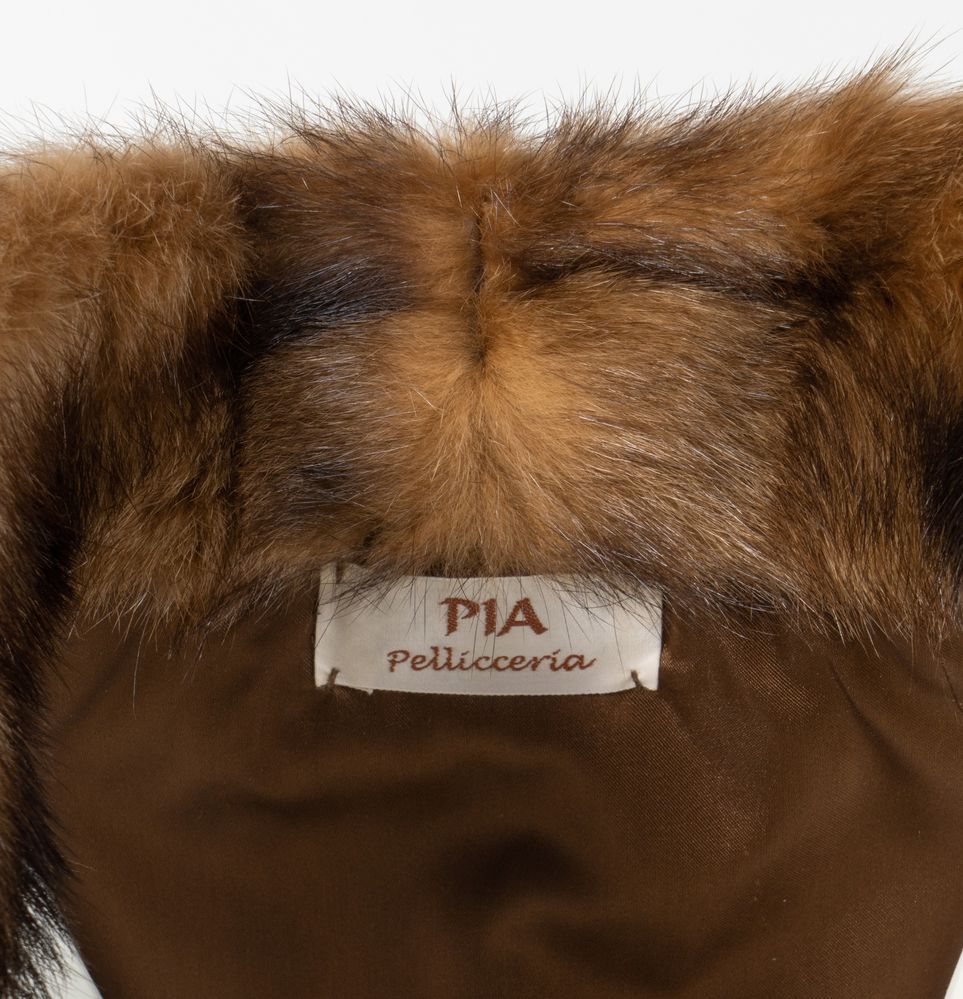 ANONIMO Pelliccia lunga in puzzola sui toni del marrone accompagnata da coprispalle nel medesimo materiale. Taglia non riportata: 42-44 circa. Reca etichetta Pia Pellicceria, Carpi.