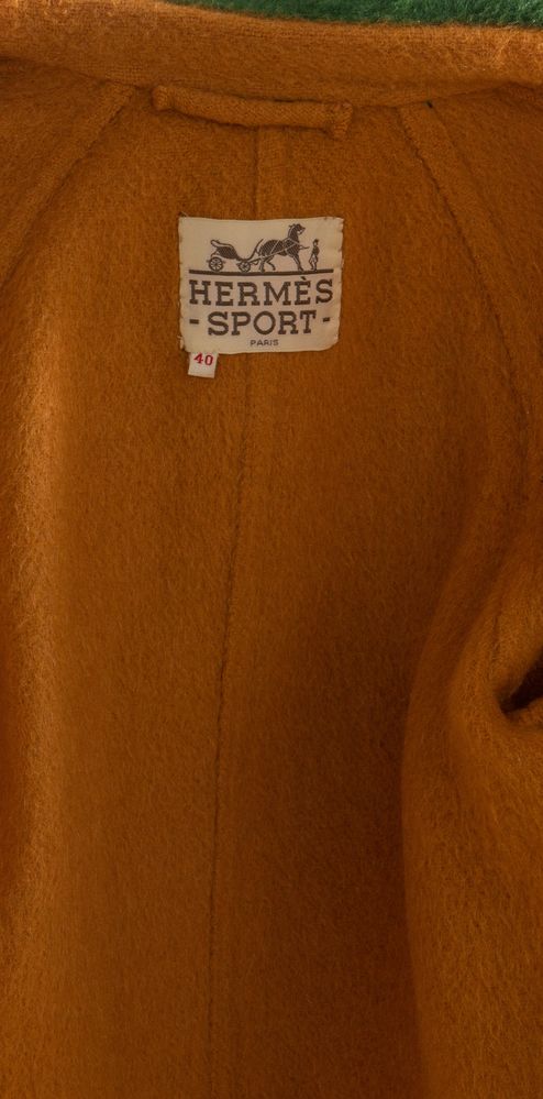 HERMÈS Sport Cappotto in lana verde con interno arancione. Riporta taglia FR...
