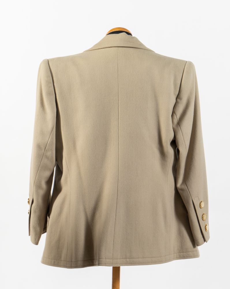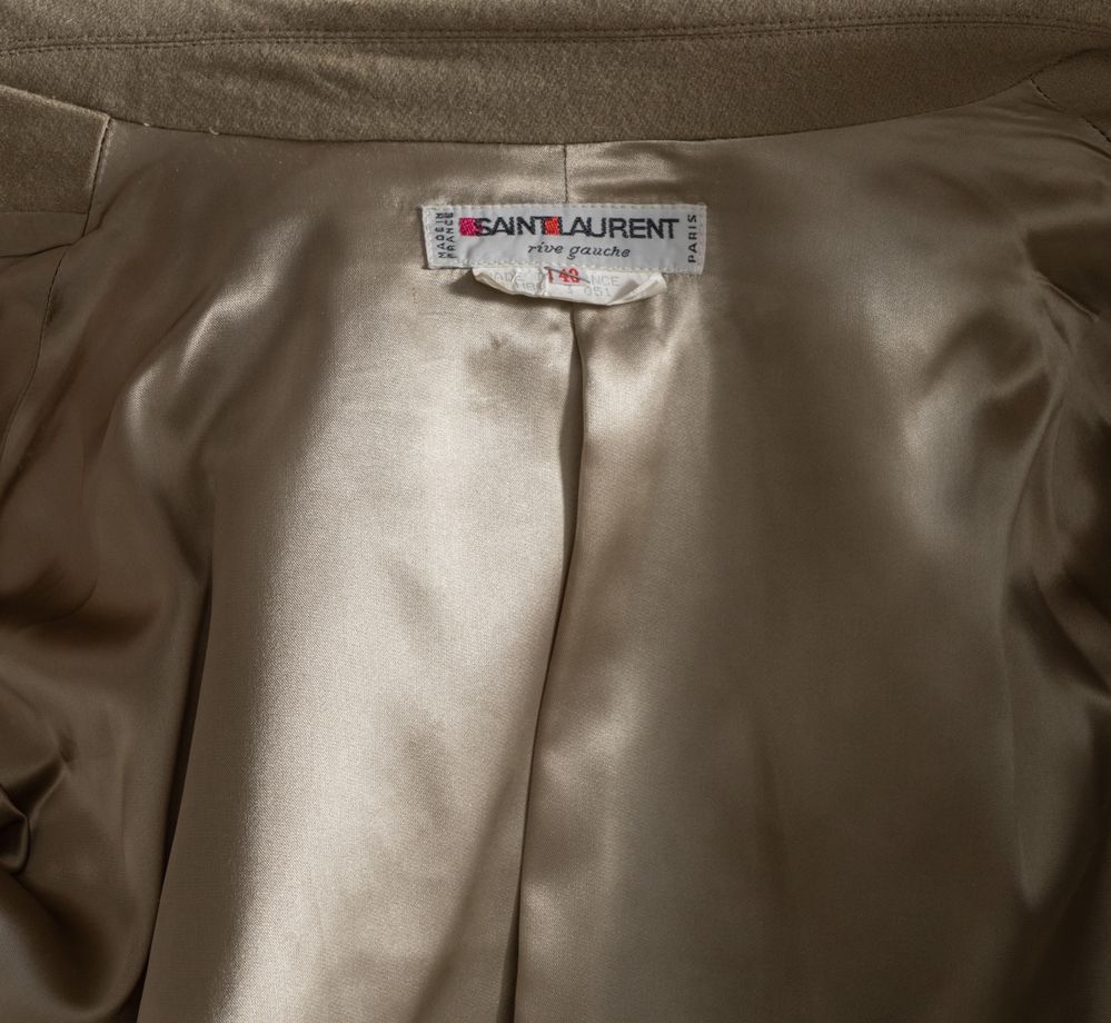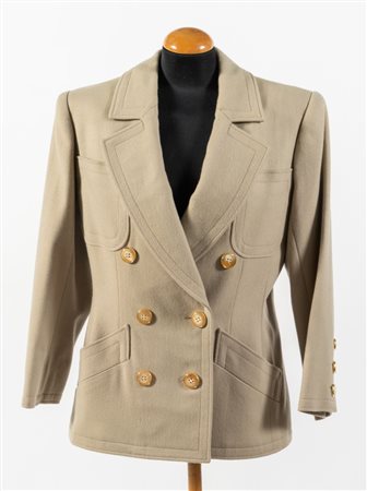 SAINT LAURENT RIVE GAUCHE Giacca doppiopetto in lana beige con bottoni rifiniti in metallo dorato. Riporta taglia FR 40. Interno rifinito con fodera beige. Reca etichetta Saint Laurent Rive Gauche Paris Made in France. (Lievi difetti)