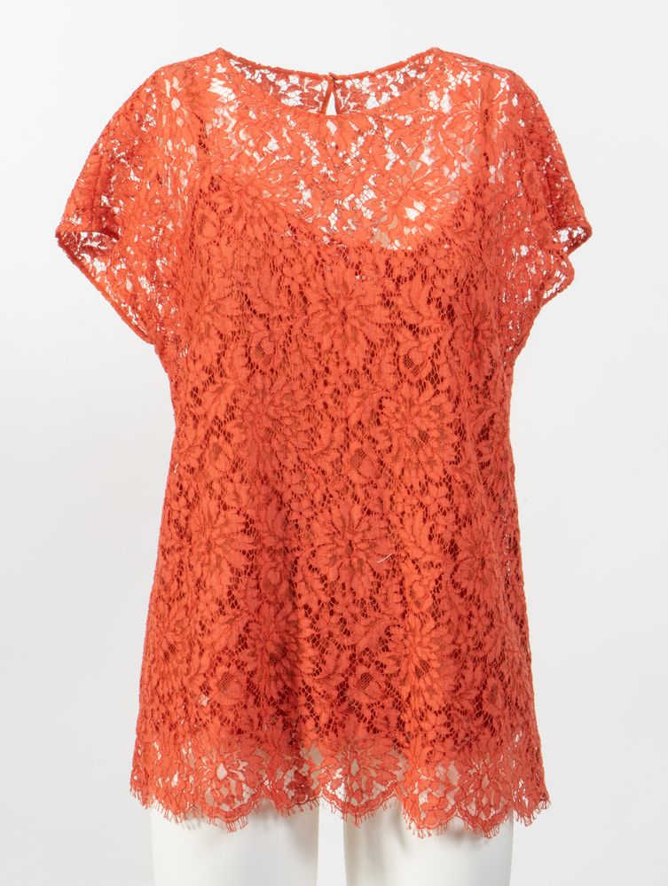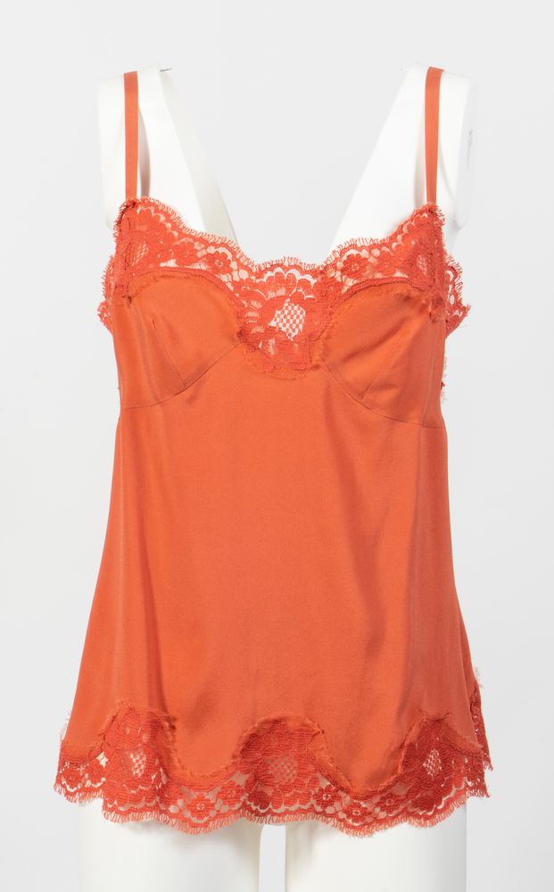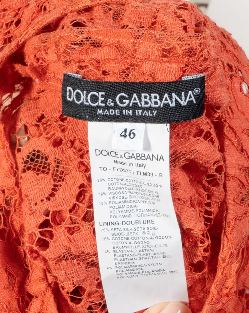 DOLCE & GABBANA Blusa in pizzo sui toni del rosso corallo. Accompagnata da sottoveste in seta e pizzo sui toni del rosso corallo. Anni '10 del XXI secolo. Riporta taglia IT 46. Composizione blusa: 68% cotone, 19% viscosa e 15% poliammidica. Composizione sottoveste: 76% seta, 16% cotone, 4% elastane e 4% poliammidica. Reca etichetta Dolce & Gabbana Made in Italy.